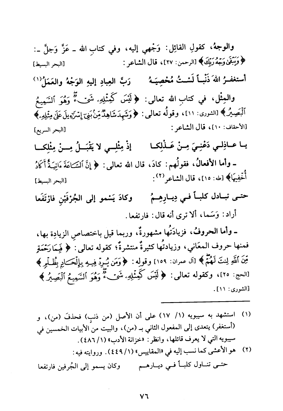 - وأما الحروفُ، فزيادَتُها مشهورةٌ، وربما قيل باختصاصِ الزيادِة بها، فمنها حروف المعَاني، وزيادتُها كثيرةٌ منتشرةٌ؛ كقوله تعالى: {فَبِمَا رَحْمَةٍ مِنَ اللَّهِ لِنْتَ لَهُمْ} [آل عمران: 159] وقوله: {وَمَنْ يُرِدْ فِيهِ بِإِلْحَادٍ بِظُلْمٍ} [الحج: 25] , وكقوله تعالى: {لَيْسَ كَمِثْلِهِ شَيْءٌ وَهُوَ السَّمِيعُ الْبَصِيرُ} [الشورى: 11].