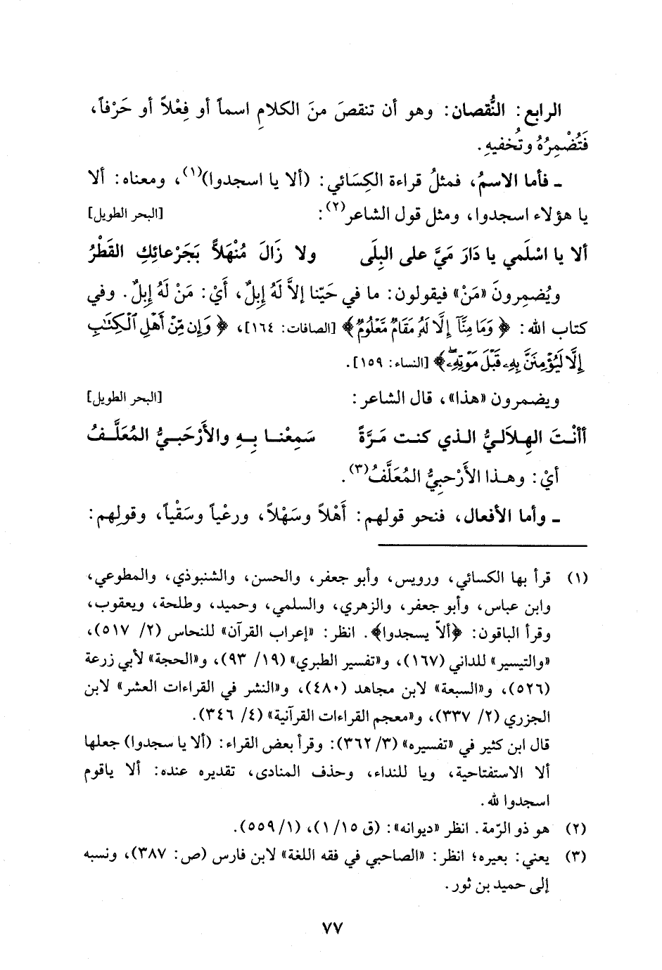 ويُضمِرونَ "مَنْ" فيْقولون: ما في حَيّنا إلَّا لَهُ إِبلٌ، أَيْ: مَنْ لَهُ إِبلٌ. وفي كتاب الله: {وَمَا مِنَّا إِلَّا لَهُ مَقَامٌ مَعْلُومٌ (164)} [الصافات: 164] , {وَإِنْ مِنْ أَهْلِ الْكِتَابِ إِلَّا لَيُؤْمِنَنَّ بِهِ قَبْلَ مَوْتِهِ} [النساء: 159].
