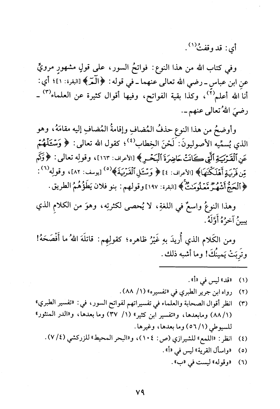 وفي كتاب الله من هذا النوع: فواتحُ السور، على قولٍ مشهورٍ مرويٍّ عنِ ابن عباس -رضي الله تعالى عنهما- في قوله: {الم} [البقرة: 1]؛ أي: أنا الله أعلم (¬2)، وكذا بقية الفواتح، وفيها أقوال كثيرة عن العلماء (¬3) -رضيَ اللهُ تعالى عنهم-.