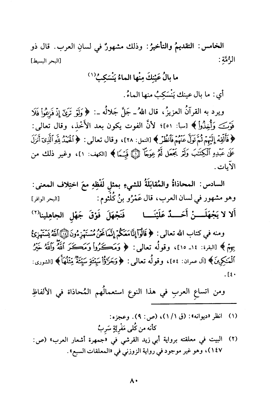 الخامس: التقديمُ والتأخيرُ: وذلك مشهورٌ في لسانِ العرب. قال ذو الرُّمَّةِ: [البحر البسيط]