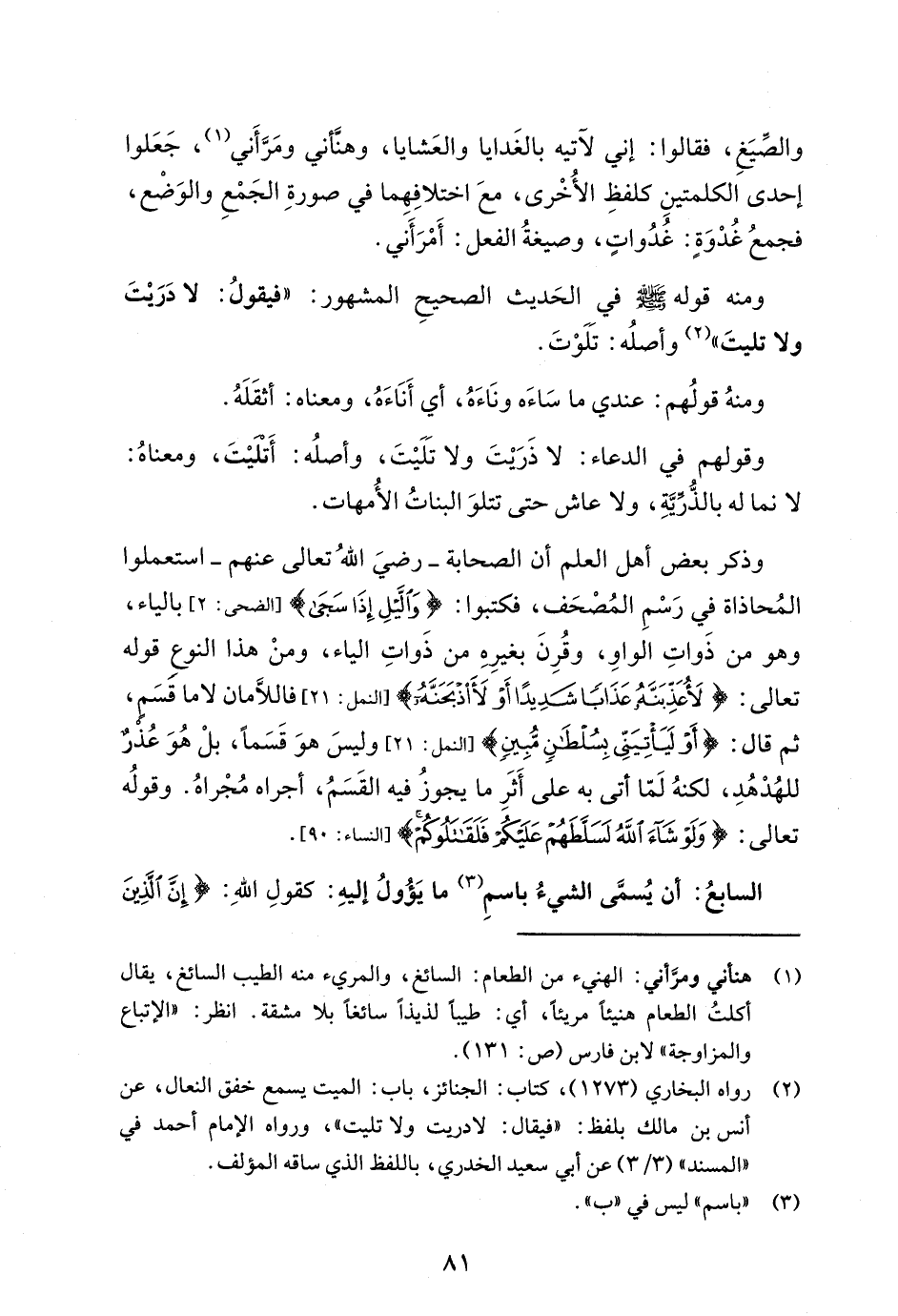والصِّيَغِ، فقالوا: إني لآتيه بالغَدايا والعَشايا، وهنَّأني ومَرَّأَني (¬1)، جَعَلوا إحدى الكلمتينِ كلفظِ الأُخْرى، معَ اختلافِهِما في صورةِ الجَمْعِ والوَضْع، فجمعُ غُدْوَةٍ: غُدُواتٍ، وصيغةُ الفعل: أَمْرَأَني.