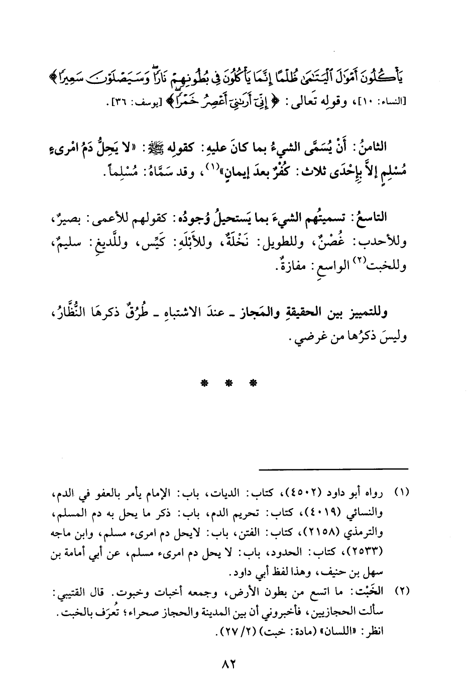 الثامنُ: أَنْ يُسَمَّى الشيءُ بما كانَ عليهِ: كقولِه - صلى الله عليه وسلم -: "لا يَحِلُّ دَمُ امْرئٍ مُسْلِمٍ إلَّا بِإِحْدَى ثلاث: كُفْرٌ بعدَ إيمانٍ" (¬1)، وقد سَمَّاهُ: مُسْلِماً.