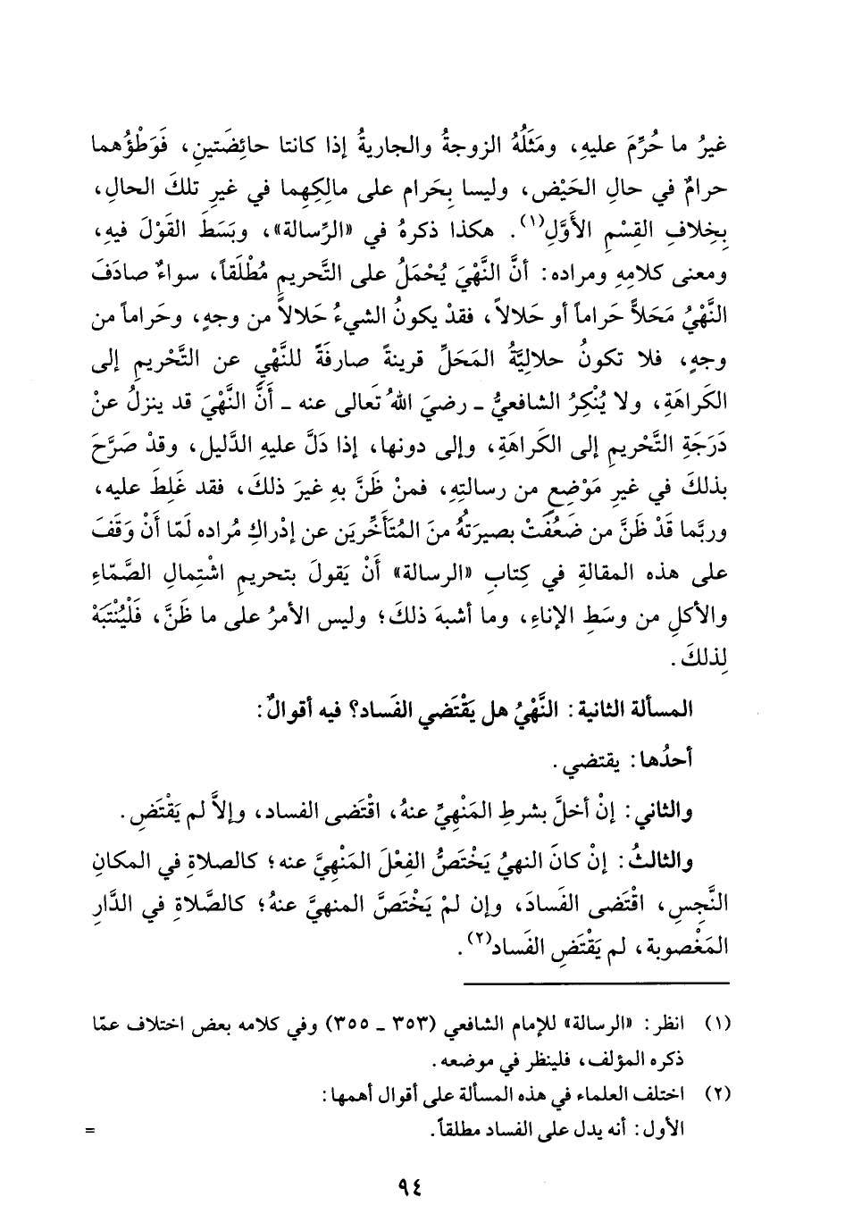 غيرُ ما حُرِّمَ عليهِ، ومَثَلُهُ الزوجةُ والجاريةُ إذا كانتا حائِضَتينِ، فَوَطْؤُهما حرامٌ في حالِ الحَيْض، وليسا بِحَرام على مالِكِهِما في غيرِ تلكَ الحالِ، بِخِلافِ القِسْمِ الأَوَّلِ (¬1). هكذا ذكرهُ في "الرِّسالة"، وبَسَطَ القَوْلَ فيهِ، ومعنى كلامِهِ ومراده: أنَّ النَّهْيَ يُحْمَلُ على التَّحريمِ مُطْلَقا، سواءٌ صادَفَ النَّهْيُ مَحَلا حَرامًا أو حَلالاً، فقدْ يكونُ الشيءُ حَلالاً من وجهٍ، وحَراماً من وجهٍ، فلا تكونُ حلالِيةُ المَحَلِّ قرينةً صارفَةً للنَّهْي عن التَّحْريمِ إلى الكَراهَةِ، ولا يُنْكِرُ الشافعيُّ -رضيَ اللهُ تَعالى عنه - أَنَّ النَّهْيَ قد ينزلُ عنْ دَرَجَةِ التَّحْريمِ إلى الكَراهَةِ، وإلى دونها، إذا دَلَّ عليهِ الدَّليل، وقدْ صَرَّحَ بذلكَ في غيرِ مَوْضِعِ من رسالتِهِ، فمنْ ظَنَّ بهِ غيرَ ذلكَ، فقد غَلِطَ عليه، وربَّما قَدْ ظَن من ضعُفتْ بصيرَته منَ المُتَأَخريَن عن إدْراكِ مُراده لَمّا أَنْ وَقَفَ على هذه المقالةِ في كِتابِ "الرسالة" أَنْ يَقولَ بتحريمِ اشْتِمالِ الصَّمّاءِ والأكلِ من وسَطِ الإناءِ، وما أشبهَ ذلكَ؛ وليس الأمرُ على ما ظَنَّ، فَلْيُنْتبَهْ لِذلكَ.
