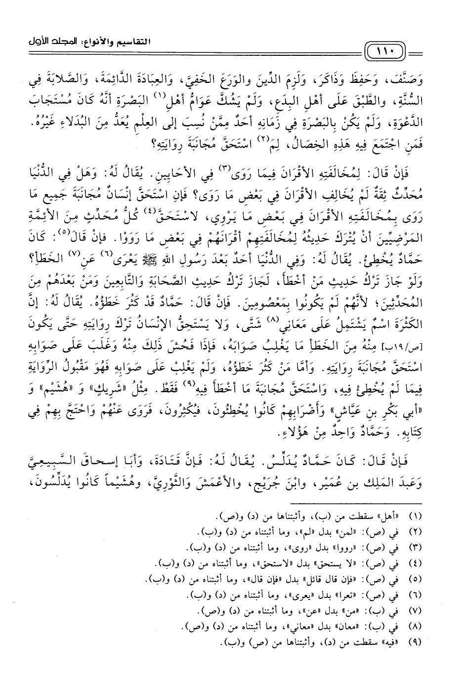 فإن قال: كان حماد يخطئ. يقال له: وفي الدنيا أحد بعد رسول الله صلى الله عليه وسلم يعرى عن الخطأ؟ ولو جاز ترك حديث من أخطأ لجاز ترك حديث الصحابة والتابعين ومن بعدهم من المحدثين لأنهم لم يكونوا بمعصومين. فإن قال: حماد قد كثر خطؤه. يقال له: إن الكثرة اسم يشتمل على معاني شتى ولا يستحق الإنسان ترك روايته حتى يكون منه من الخطأ ما يغلب صوابه فإذا فحش ذلك منه وغلب على صوابه استحق مجانية روايته وأما من كثر خطؤه ولم يغلب على صوابه فهو مقبول الرواية فيما لم يخطئ فيه واستحق مجانبة ما أخطأ فيه فقط. مثل "شريك" و "هشيم" و "أبي بكر بن عياش" وأضرابهم كانوا يخطئون فيكثرون فروى عنهم واحتج بهم في كتابه. وحماد واحد من هؤلاء.