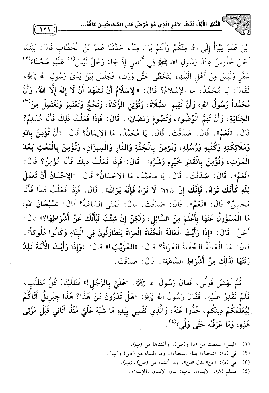قَالَ: صَدَقْتَ، قَالَ: يَا مُحَمَّدُ، مَا الإِحْسَانُ؟ قَالَ: "الإِحْسَانُ أَنْ تَعْمَلَ للهِ كَأَنَّكَ تَرَاهُ، فَإِنَّكَ إِنْ لَا تَرَاهُ، فَإِنَّهُ يَرَاكَ". قَالَ: فَإِذَا فَعَلْتُ هَذَا، فَأَنَا مُحْسِنٌ؟ قَالَ: "نَعَمْ". قَالَ: صَدَقْتَ، قَالَ: فَمَتَى السَّاعَةُ؟ قَالَ: "سُبْحَانَ اللهِ، مَا الْمَسْؤُولُ عَنْهَا بِأَعْلَمَ مِنَ السَّائِلِ، وَلَكِنْ إِنْ شِئْتَ نَبَّأْتُكَ عَنْ أَشْرَاطِهَا؟ "، قَالَ: أَجَلْ، قَالَ: "إِذَا رَأَيْتَ الْعَالَةَ الْحُفَاةَ الْعُرَاةَ يَتَطَاوَلُونَ فِي الْبِنَاءِ، وَكَانُوا مُلُوكًا"، قَالَ: مَا الْعَالَةُ الْحُفَاةُ الْعُرَاةُ؟ قَالَ: "الْعُرَيْبُ! " قَالَ: "وَإِذَا رَأَيْتَ الأَمَةَ تَلِدُ رَبَّتَهَا، فَذَلِكَ مِنْ أَشْرَاطِ السَّاعَةِ"، قَالَ: صَدَقْتَ. ثُمَّ نَهَضَ فَوَلَّى، فَقَالَ رَسُولُ اللهِ صَلى الله عَلَيه وسَلم: "عَلَيَّ بِالرَّجُلِ! " فَطَلَبْنَاهُ كُلَّ مَطْلَبٍ فَلَمْ نَقْدِرْ عَلَيْهِ، فَقَالَ رَسُولُ اللهِ صَلى الله عَلَيه وسَلم: "هَلْ تَدْرُونَ مَنْ هَذَا؟ هَذَا جِبْرِيلُ أَتَاكُمْ لَيُعَلِّمَكُمْ دِينَكُمْ، خُذُوا عَنْهُ، وَالَّذِي نَفْسِي بِيَدِهِ مَا شُبِّهَ عَلَيَّ مُنْذُ أَتَانِي قَبْلَ مَرَّتِي هَذِهِ، وَمَا عَرَفْتُهُ حَتَّى وَلَّى".
