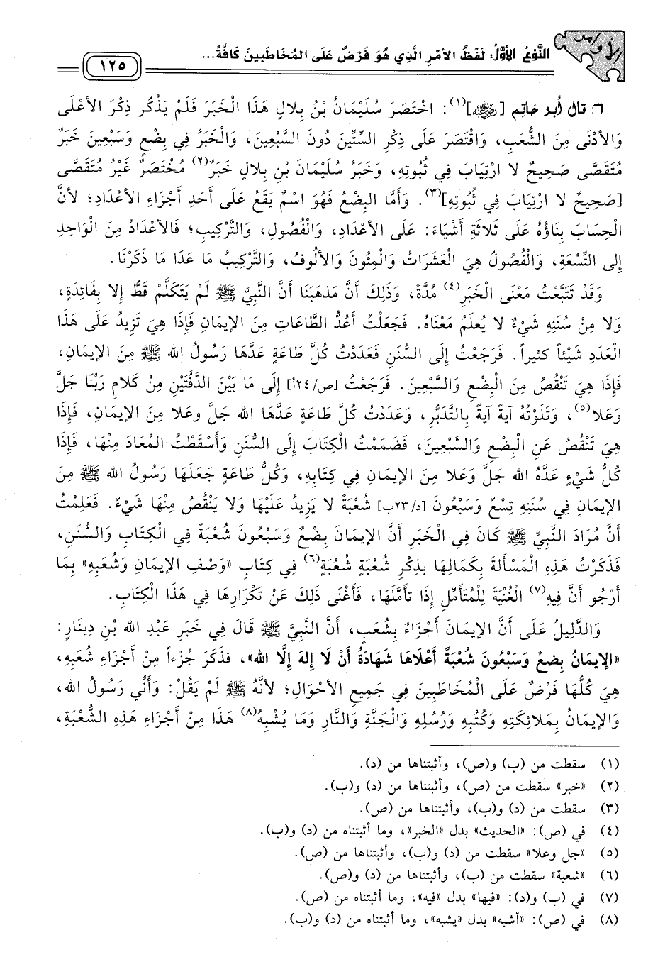 فَرَجَعْتُ إِلَى مَا بَيْنَ الدَّفَّتَيْنِ مِنْ كَلَامِ رَبِّنَا جَلَّ وَعَلَا، وَتَلَوْتُهُ آيَةً آيَةً بِالتَّدَبُّرِ، وَعَدَدْتُ كُلَّ طَاعَةٍ عَدَّهَا اللهُ جَلَّ وَعَلَا مِنَ الإِيمَانِ، فَإِذَا هِيَ تَنْقُصُ عَنِ الْبِضْعِ وَالسَّبْعِينَ، فَضَمَمْتُ الْكِتَابَ إِلَى السُّنَنِ، وَأَسْقَطْتُ الْمُعَادَ مِنْهَا، فَإِذَا كُلُّ شَيْءٍ عَدَّهُ اللهُ جَلَّ وَعَلَا مِنَ الإِيمَانِ فِي كِتَابِهِ، وَكُلُّ طَاعَةٍ جَعَلَهَا رَسُولُ اللهِ صَلى الله عَلَيه وسَلم مِنَ الإِيمَانِ فِي سُنَنِهِ تِسْعٌ وَسَبْعُونَ شُعْبَةً لَا يَزِيدُ عَلَيْهَا وَلَا يَنْقُصُ مِنْهَا شَيْءٌ، فَعَلِمْتُ أَنَّ مُرَادَ النَّبِيِّ صَلى الله عَلَيه وسَلم كَانَ فِي الْخَبَرِ أَنَّ الإِيمَانَ بِضْعٌ وَسَبْعُونَ شُعْبَةً فِي الْكِتَابِ وَالسُّنَنِ، فَذَكَرْتُ هَذِهِ الْمَسْأَلَةَ بِكَمَالِهَا بِذِكْرِ شُعْبَةٍ شُعْبَةٍ فِي كِتَابِ "وَصْف الإِيمَانِ وَشُعَبِهِ" بِمَا أَرْجُو أَنَّ فِيهِ الْغُنْيَةَ لِلْمُتَأَمِّلِ إِذَا تَأَمَّلَهَا، فَأَغْنَى ذَلِكَ عَنْ تِكْرَارهَا فِي هَذَا الْكِتَابِ.