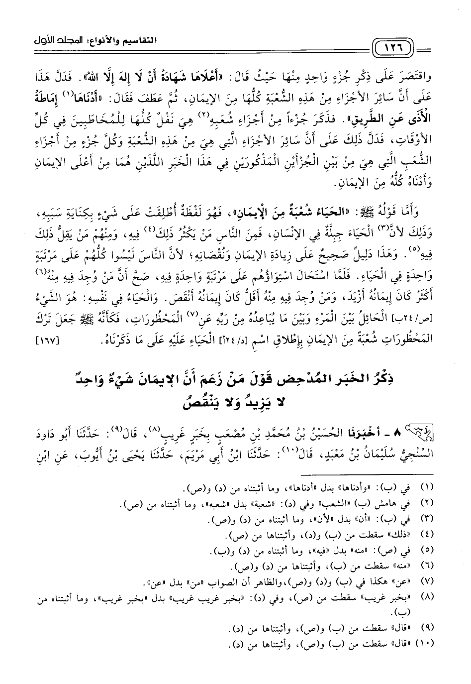 وَاقْتَصَرَ عَلَى ذِكْرِ جُزْءٍ وَاحِدٍ مِنْهَا، حَيْثُ قَالَ: "أَعْلَاهَا شَهَادَةُ أَنْ لَا إِلَهَ إِلَاّ اللهُ". فَدَلَّ هَذَا عَلَى أَنَّ سَائِرَ الأَجْزَاءِ مِنْ هَذِهِ الشُّعْبَةِ كُلُّهَا مِنَ الإِيمَانِ، ثُمَّ عَطَفَ فَقَالَ: "أَدْنَاهَا إِمَاطَةُ الأَذَى عَنِ الطَّرِيقِ"، فَذَكَرَ جُزْءًا مِنْ أَجْزَاءِ شُعَبِهِ هِيَ نَفْلٌ كُلُّهَا لِلْمُخَاطَبِينَ فِي كُلِّ الأَوْقَاتِ، فَدَلَّ ذَلِكَ عَلَى أَنَّ سَائِرَ الأَجْزَاءِ الَّتِي هِيَ مِنْ هَذِهِ الشُّعْبَةِ وَكُلَّ جُزْءٍ مِنْ أَجْزَاءِ الشُّعَبِ الَّتِي هِيَ مِنْ بَيْنِ الْجُزْأَيْنِ الْمَذْكُورَيْنِ فِي هَذَا الْخَبَرِ اللَّذَيْنِ هُمَا مِنْ أَعْلَى الإِيمَانِ وَأَدْنَاهُ كُلُّهُ مِنَ الإِيمَانِ.