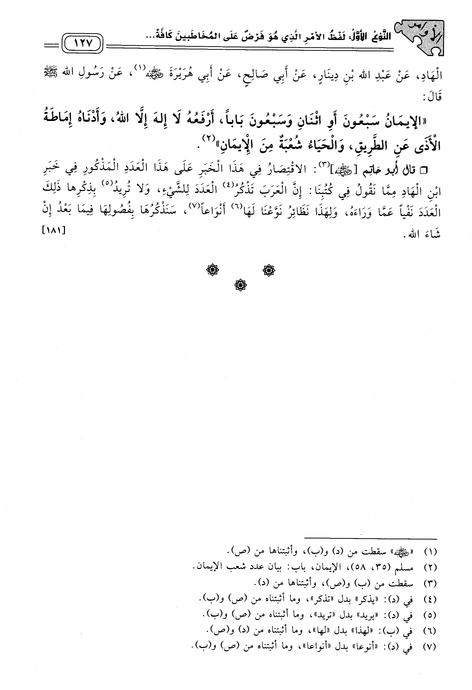 قَالَ أَبُو حَاتِمٍ رضي الله عنه: الاِقْتِصَارُ فِي هَذَا الْخَبَرِ عَلَى هَذَا الْعَدَدِ الْمَذْكُورِ فِي خَبَرِ ابْنِ الْهَادِ مِمَّا نَقُولُ فِي كُتُبِنَا: إِنَّ الْعَرَبَ تَذْكُرُ الْعَدَدَ لِلشَّيْءِ، وَلَا تُرِيدُ بِذِكْرِهَا ذَلِكَ الْعَدَدَ نَفْيًا عَمَّا وَرَاءَهُ، وَلِهَذَا نَظَائِرُ نَوَّعْنَا لَهَا أَنْوَاعًا، سَنَذْكُرُهَا بِفُصُولِهَا فِيمَا بَعْدُ إِنْ شَاءَ اللهُ. [١٨١]