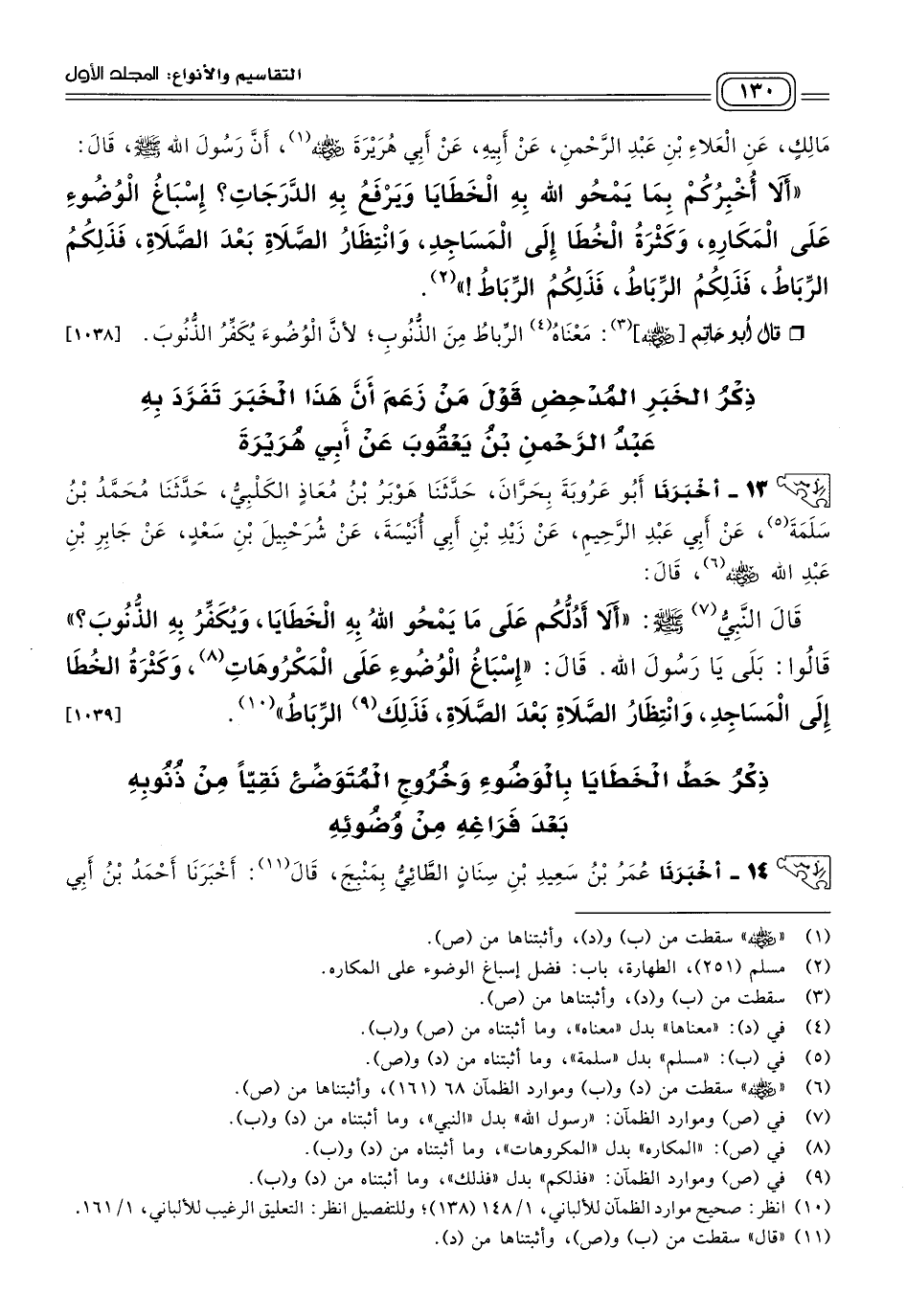 ١٣ - أَخبَرنا أَبُو عَرُوبَةَ بِحَرَّانَ، حَدثنا هَوْبَرُ بْنُ مُعَاذٍ الْكَلْبِيُّ، حَدثنا مُحَمَّدُ بْنُ سَلَمَةَ، عَنْ أَبِي عَبْدِ الرَّحِيمِ، عَنْ زَيْدِ بْنِ أَبِي أُنَيْسَةَ، عَنْ شُرَحْبِيلَ بْنِ سَعْدٍ، عَنْ جَابِرِ بْنِ عَبْدِ اللهِ رَضِيَ اللهُ عَنْهُ، قَالَ: قَالَ النَّبِيُّ صَلى الله عَلَيه وسَلم: "أَلَا أَدُلُّكُمْ عَلَى مَا يَمْحُو اللهُ بِهِ الْخَطَايَا، وَيُكَفَّرُ بِهِ الذُّنُوبَ؟ " قَالُوا: بَلَى يَا رَسُولَ اللهِ، قَالَ: "إِسْبَاغُ الْوُضُوءِ عَلَى الْمَكْرُوهَاتِ، وَكَثْرَةُ الْخُطَا إِلَى الْمَسَاجِدِ، وَانْتِظَارُ الصَّلَاةِ بَعْدَ الصَّلَاةِ، فَذَلِكَ الرِّبَاطُ". [١٠٣٩]