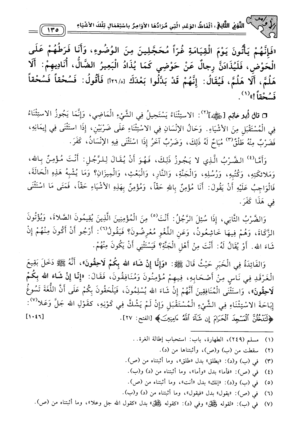 قَالَ أَبُو حَاتِمٍ رَضِيَ اللهُ عَنْهُ: الاِسْتِثْنَاءُ يَسْتَحِيلُ فِي الشَّيْءِ الْمَاضِي، وَإِنَّمَا يَجُوزُ الاِسْتِثْنَاءُ فِي الْمُسْتَقْبَلِ مِنَ الأَشْيَاءِ. وَحَالُ الإِنْسَانِ فِي الاِسْتِثْنَاءِ عَلَى ضَرْبَيْنِ، إِذَا اسْتَثْنَى فِي إِيمَانِهِ، فَضَرْبٌ مِنْهُ طْلَق مُبَاحٌ لَهُ ذَلِكَ، وَضَرْبٌ آخَرُ إِذَا اسْتَثْنَى فِيهِ الإِنْسَانُ كَفَرَ.