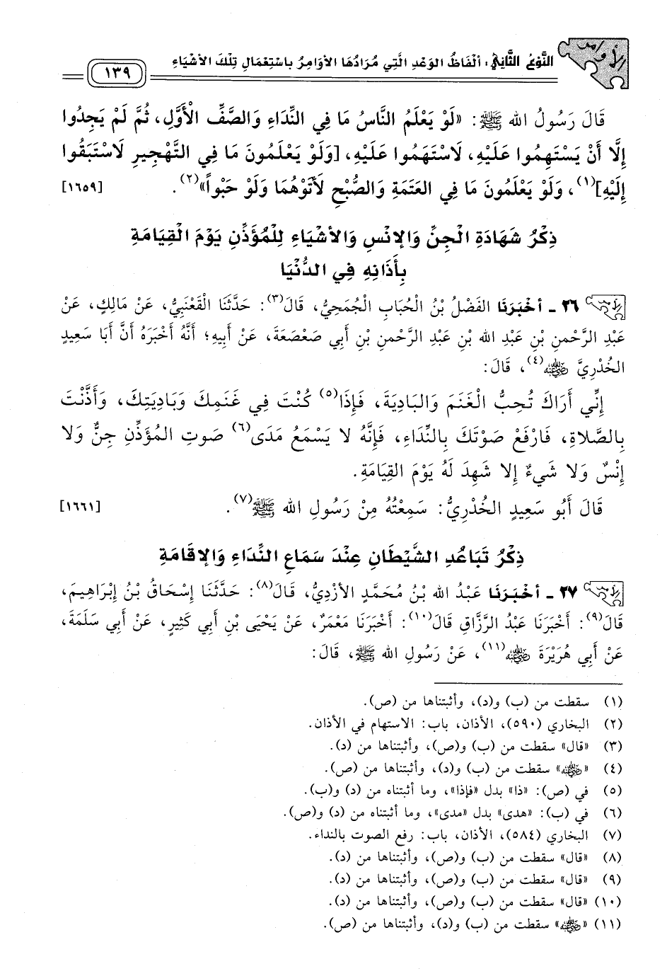 ٢٦ - أَخبَرنا الْفَضْلُ بْنُ الْحُبَابِ الْجُمَحِيُّ، قال: حَدثنا الْقَعْنَبِيُّ، عَنْ مَالِكٍ، عَنْ عَبْدِ الرَّحْمَنِ بْنِ عَبْدِ اللهِ بْنِ عَبْدِ الرَّحْمَنِ بْنِ أَبِي صَعْصَعَةَ، عَنْ أَبِيهِ، أَنَّهُ أَخْبَرَهُ أَنَّ أَبَا سَعِيدٍ الْخُدْرِيَّ رَضِيَ اللهُ عَنْهُ، قَالَ: إِنِّي أَرَاكَ تُحِبُّ الْغَنَمَ وَالْبَادِيَةَ، فَإِذَا كُنْتَ فِي غَنَمِكَ وَبَادِيَتِكَ، وَأَذَّنْتَ بِالصَّلَاةِ فَارْفَعْ صَوْتَكَ بِالنِّدَاءِ، فَإِنَّهُ لَا يَسْمَعُ مَدَى صَوْتِ الْمُؤَذِّنِ جِنٌّ وَلَا إِنْسٌ وَلَا شَيْءٌ إِلَاّ شَهِدَ لَهُ يَوْمَ الْقِيَامَةِ.
