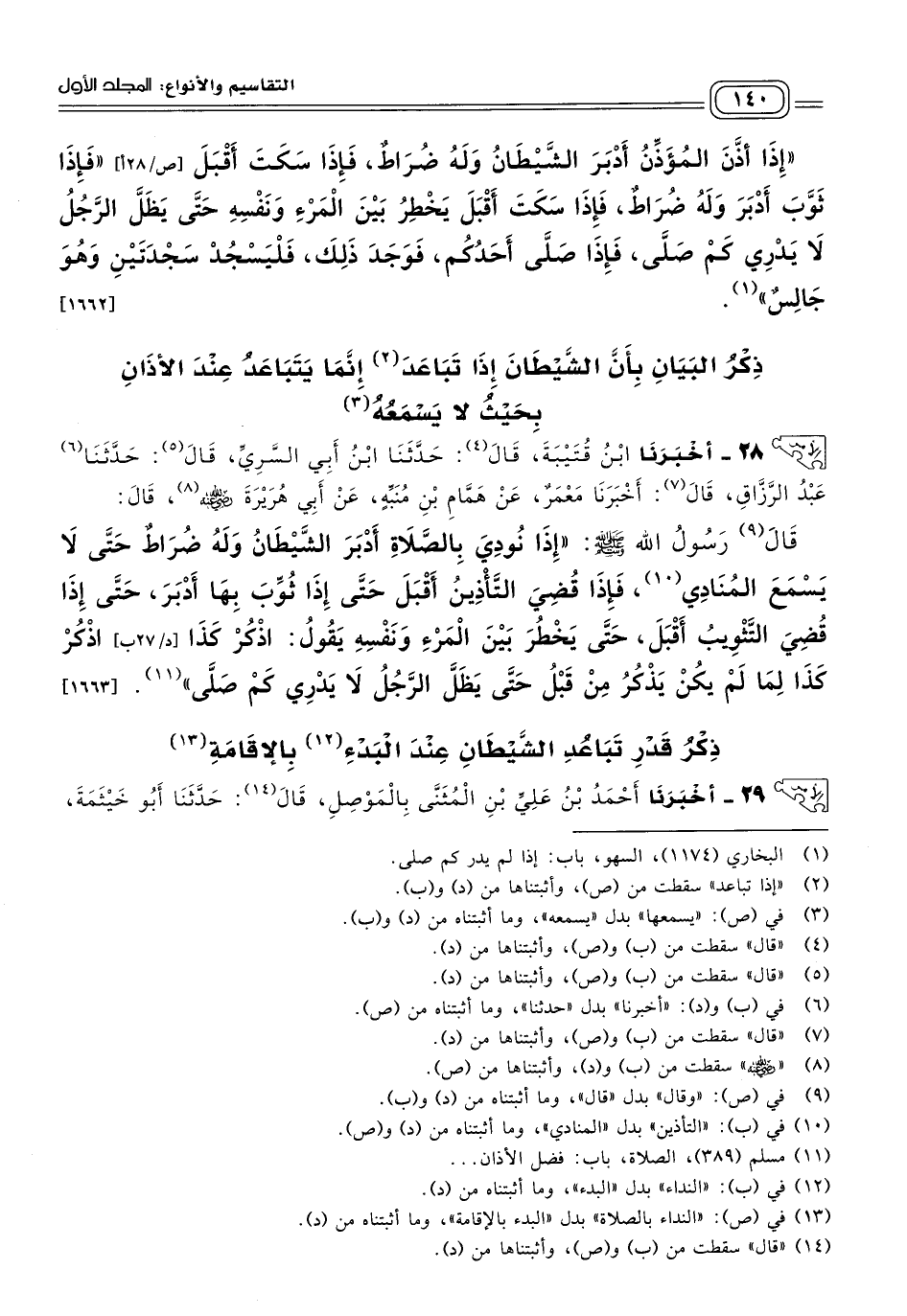 ٢٨ - أَخبَرنا ابْنُ قُتَيْبَةَ، قال: حَدثنا ابْنُ أَبِي السَّرِيِّ، قال: حدثنا عَبْدُ الرَّزَّاقِ، قال: أَخبَرنا مَعْمَرٌ، عَنْ هَمَّامِ بْنِ مُنَبِّهٍ، عَنْ أَبِي هُرَيْرَةَ رَضِيَ اللهُ عَنْهُ، قَالَ: قَالَ رَسُولُ اللهِ صَلى الله عَلَيه وسَلم: "إِذَا نُودِيَ بِالصَّلَاةِ أَدْبَرَ الشَّيْطَانُ وَلَهُ ضُرَاطٌ حَتَّى لَا يَسْمَعَ المنادي، فَإِذَا قُضِيَ التَّأْذِينُ أَقْبَلَ حَتَّى إِذَا ثُوِّبَ بِهَا أَدْبَرَ، حَتَّى إِذَا قُضِيَ التَّثْوِيبُ أَقْبَلَ، حَتَّى يَخْطُرَ بَيْنَ الْمَرْءِ وَنَفْسِهِ يَقُولُ: اذْكُرْ كَذَا، اذْكُرْ كَذَا، لِمَا لَمْ يَكُنْ يَذْكُرُ مِنْ قَبْلُ، حَتَّى يَظَلَّ الرَّجُلُ لَا يَدْرِي كَمْ صَلَّى". [١٦٦٣]