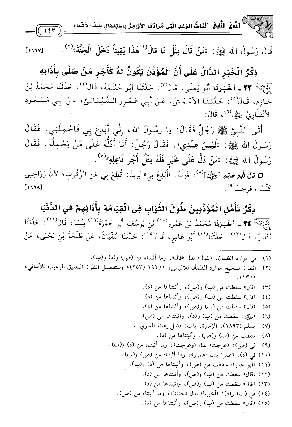 ٣٤ - أَخبَرنا مُحَمَّدُ بْنُ عمرو بْنِ يُوسُفَ أَبُو حَمْزَةَ، بِنَسَا، قال: حَدثنا بُنْدَارٌ، قال: حدثنا أَبُو عَامِرٍ، قال: حَدثنا سُفْيَانُ، عَنْ طَلْحَةَ بْنِ يَحْيَى، عَنْ عِيسَى بْنِ طَلْحَةَ، قال: سَمِعْتُ مُعَاوِيَةَ بْنَ أَبِي سُفْيَانَ رَضِيَ اللهُ عَنْهُ، يَقُولُ: قَالَ رَسُولُ اللهِ صَلى الله عَلَيه وسَلم: "الْمُؤَذِّنُونَ أَطْوَلُ النَّاسِ أَعْنَاقًا يَوْمَ الْقِيَامَةِ". [١٦٦٩]