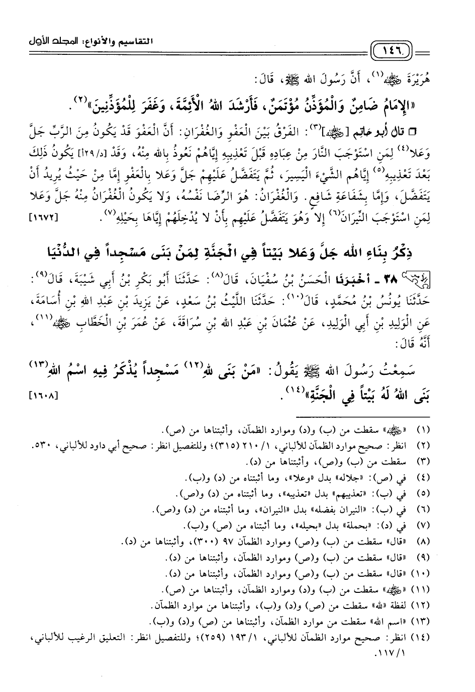 ٣٨ - أَخبَرنا الْحَسَنُ بْنُ سُفْيَانَ، قال: حَدثنا أَبُو بَكْرِ بْنُ أَبِي شَيْبَةَ، قال: حَدثنا يُونُسُ بْنُ مُحَمَّدٍ، قال: حَدثنا اللَّيْثُ بْنُ سَعْدٍ، عَنْ يَزِيدَ بْنِ عَبْدِ اللهِ بْنِ أُسَامَةَ، عَنِ الْوَلِيدِ بْنِ أَبِي الْوَلِيدِ، عَنْ عُثْمَانَ بْنِ عَبْدِ اللهِ بْنِ سُرَاقَةَ، عَنْ عُمَرَ بْنِ الْخَطَّابِ رَضِيَ اللهُ عَنْهُ، أَنَّهُ قَالَ: سَمِعْتُ رَسُولَ اللهِ صَلى الله عَلَيه وسَلم، يَقُولُ: "مَنْ بَنَى لله مَسْجِدًا يَذْكُرُ فِيهِ اسْمَ اللهِ، بَنَى اللهُ لَهُ بَيْتًا فِي الْجَنَّةِ". [١٦٠٨]