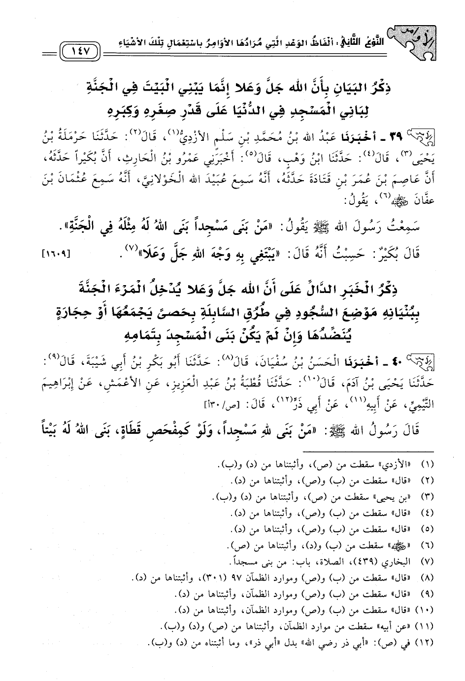 قَالَ رَسُولُ اللهِ صَلى الله عَلَيه وسَلم: "مَنْ بَنَى للهِ مَسْجِدًا وَلَوْ كَمَفْحَصِ قَطَاةٍ، بَنَى اللهُ لَهُ بَيْتًا فِي الْجَنَّةِ". [١٦١٠]