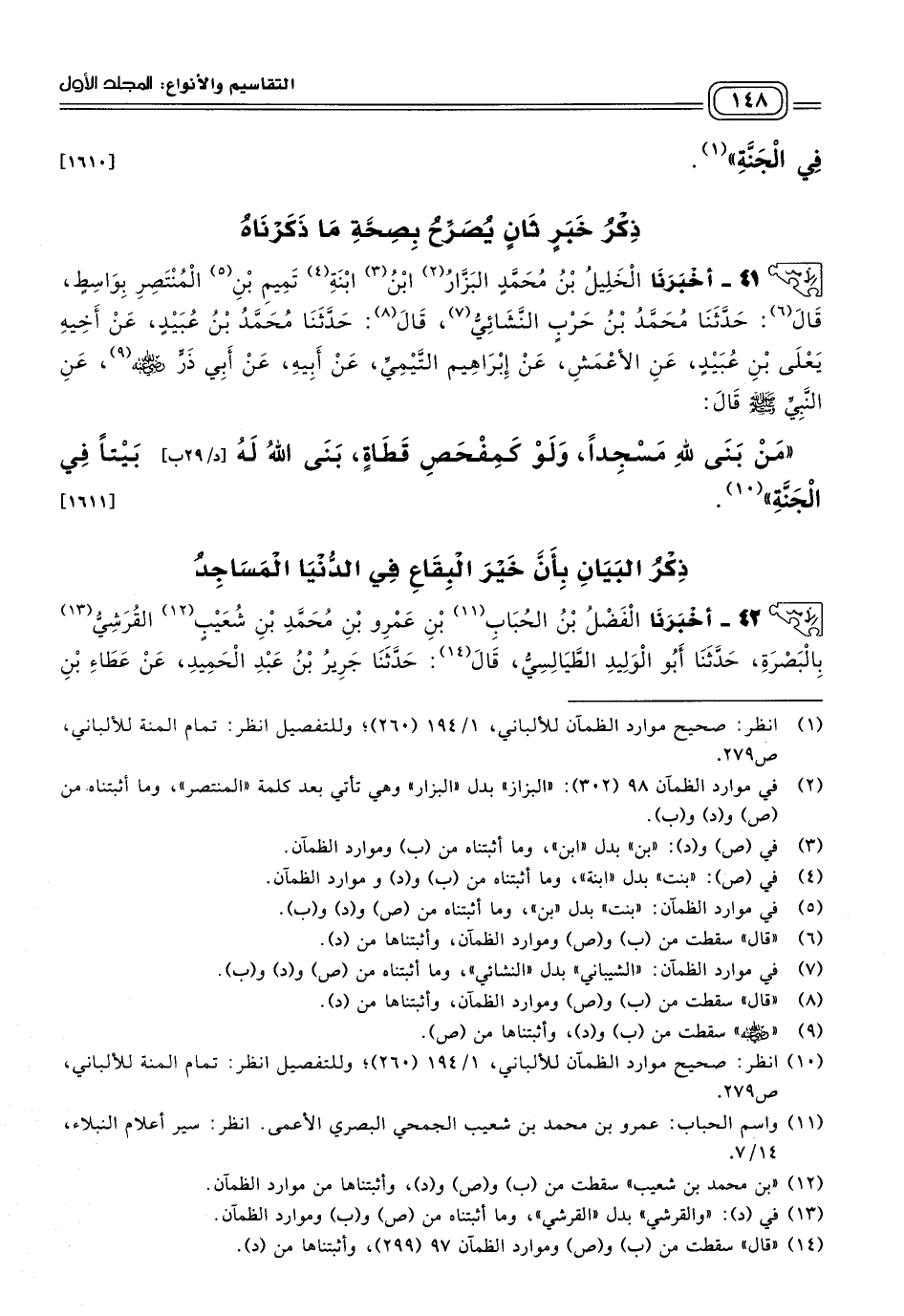 "من بني لله مسجدا، ولو كمفحص قطاة، بنى الله له بيتا في الجنة". [١٦١١]