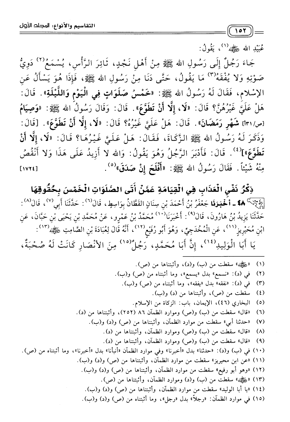 جَاءَ رَجُلٌ إِلَى رَسُولِ اللهِ صَلى الله عَلَيه وسَلم مِنْ أَهْلِ نَجْدٍ، ثَائِرُ الرَّأْسِ، يُسْمَعُ دَوِيُّ صَوْتِهِ وَلَا يُفْقَهُ مَا يَقُولُ، حَتَّى دَنَا مِنْ رَسُولِ اللهِ صَلى الله عَلَيه وسَلم، فَإِذَا هُوَ يَسْأَلُ عَنِ الإِسْلَامِ، فَقَالَ لَهُ رَسُولُ اللهِ صَلى الله عَلَيه وسَلم: "خَمْسُ صَلَوَاتٍ فِي الْيَوْمِ وَاللَّيْلَةِ"، قَالَ: هَلْ عَلَيَّ غَيْرُهُنَّ؟ قَالَ: "لَا إِلَاّ أَنْ تَطَوَّعَ"، قَالَ: وَقَالَ رَسُولُ اللهِ صَلى الله عَلَيه وسَلم: "وَصِيَامُ شَهْرِ رَمَضَانَ"، قَالَ: هَلْ عَلَيَّ غَيْرُهُ؟ قَالَ: "لَا إِلَاّ أَنْ تَطَوَّعَ"، قَالَ: وَذَكَرَ لَهُ رَسُولُ اللهِ صَلى الله عَلَيه وسَلم الزَّكَاةَ، فَقَالَ: هَلْ عَلَيَّ غَيْرُهَا؟ قَالَ: "لَا إِلَاّ أَنْ تَطَوَّعَ،" قَالَ: فَأَدْبَرَ الرَّجُلُ وَهُوَ يَقُولُ: وَاللهِ لَا أَزِيدُ عَلَى هَذَا وَلَا أَنْقُصُ مِنْهُ شَيْئًا، فَقَالَ رَسُولُ اللهِ صَلى الله عَلَيه وسَلم: "أَفْلَحَ إِنْ صَدَقَ". [١٧٢٤]