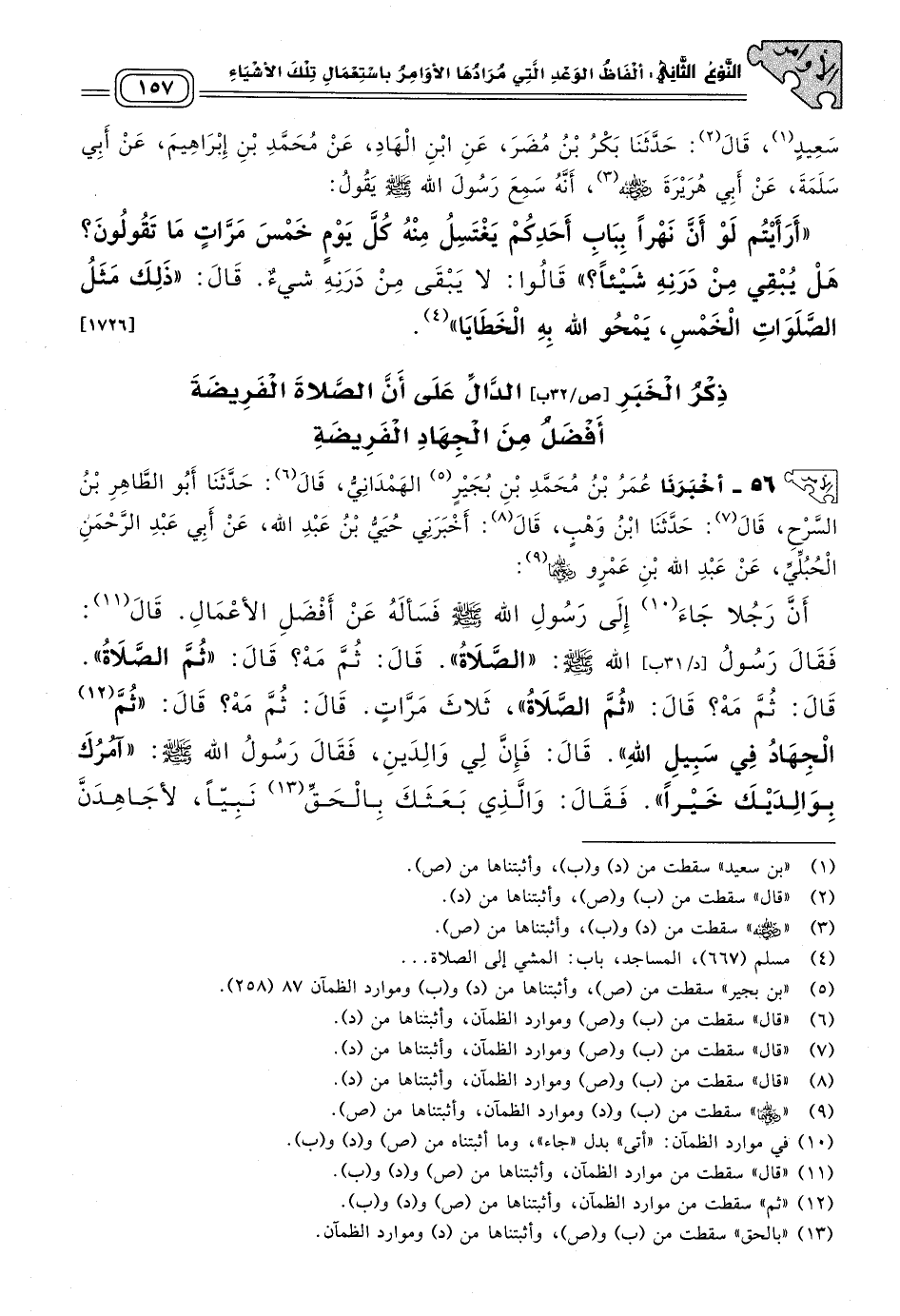 ٥٦ - أَخبَرنا عُمَرُ بْنُ مُحَمَّدِ بْنِ بُجَيْرٍ الْهَمْدَانِيُّ، قال: حَدثنا أَبُو الطَّاهِرِ بْنُ السَّرْحِ، قال: حَدثنا ابْنُ وَهْبٍ، قال: أَخْبَرَنِي حُيَيُّ بْنُ عَبْدِ اللهِ، عَنْ أَبِي عَبْدِ الرَّحْمَنِ الْحُبُلِيِّ، عَنْ عَبْدِ اللهِ بْنِ عَمْرٍو رَضِيَ اللهُ عَنْهُما، أَنَّ رَجُلاً جَاءَ إِلَى رَسُولِ اللهِ صَلى الله عَلَيه وسَلم، فَسَأَلَهُ عَنْ أَفْضَلِ الأَعْمَالِ، قَالَ: فَقَالَ رَسُولُ اللهِ صَلى الله عَلَيه وسَلم: "الصَّلَاةُ"، قَالَ: ثُمَّ مَهْ؟ قَالَ: "ثُمَّ الصَّلَاةُ"، قَالَ: ثُمَّ مَهْ؟ قَالَ: "ثُمَّ الصَّلَاةُ"، ثَلَاثَ مَرَّاتٍ، قَالَ: ثُمَّ مَهْ؟ قَالَ: "ثُمَّ الْجِهَادُ فِي سَبِيلِ اللهِ"، قَالَ: فَإِنَّ لِي وَالِدَيْنِ، فَقَالَ رَسُولُ اللهِ صَلى الله عَلَيه وسَلم: "آمُرُكَ بِوَالِدَيْكَ خَيْرًا"، فَقَالَ: وَالَّذِي بَعَثَكَ بالحق نَبِيًّا، لأُجَاهِدَنَّ وَلأَتْرُكَنَّهُمَا، قَالَ: فَقَالَ رَسُولُ اللهِ صَلى الله عَلَيه وسَلم: "فَأَنْتَ أَعْلَمُ". [١٧٢٢]