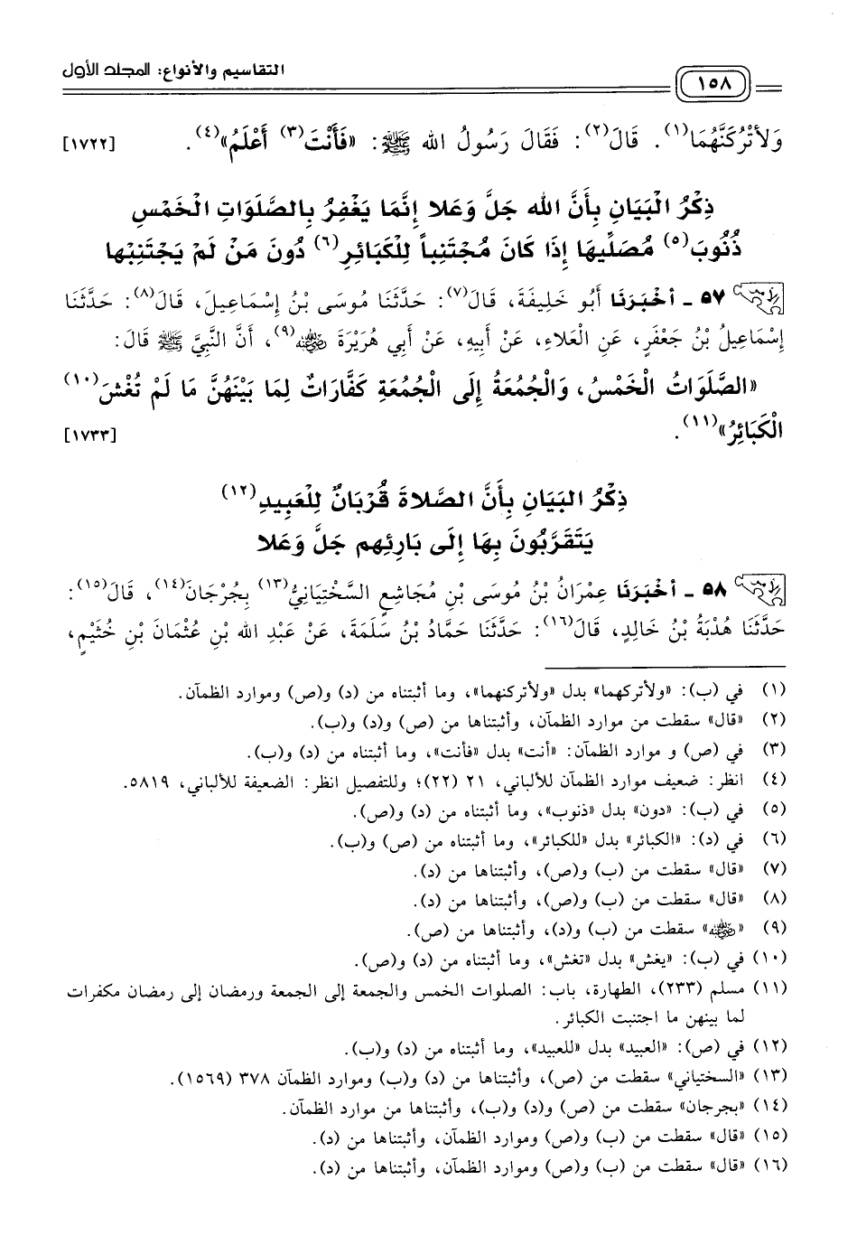 ٥٨ - أَخبَرنا عِمْرَانُ بْنُ مُوسَى بْنِ مُجَاشِعٍ السِّخْتِيَانِيُّ، بجرجان، قال: حَدثنا هُدْبَةُ بْنُ خَالِدٍ، قال: حَدثنا حَمَّادُ بْنُ سَلَمَةَ، عَنْ عَبْدِ اللهِ بْنِ عُثْمَانَ بْنِ خُثَيْمٍ، عَنْ عَبْدِ الرَّحْمَنِ بْنِ سَابِطٍ، عَنْ جَابِرِ بْنِ عَبْدِ اللهِ رَضِيَ اللهُ عَنْهُما، أَنَّ النَّبِيَّ صَلى الله عَلَيه وسَلم قَالَ: "يَا كَعْبُ بْن عُجْرَةَ، أُعِيذُكَ بِاللهِ مِنْ إِمَارَةِ السُّفَهَاءِ، إِنَّهَا سَتَكُونُ أُمَرَاءُ، مَنْ دَخَلَ عَلَيْهِمْ فَأَعَانَهُمْ عَلَى ظُلْمِهِمْ وَصَدَّقَهُمْ بِكَذِبِهِمْ فَلَيْسَ مِنِّي، وَلَسْتُ مِنْهُ، وَلَنْ يَرِدَ عَلَيَّ الْحَوْضَ، وَمَنْ لَمْ يَدْخُلْ عَلَيْهِمْ، وَلَمْ يُعِنْهُمْ عَلَى ظُلْمِهِمْ، وَلَمْ يُصَدِّقْهُمْ بِكَذِبِهِمْ، فَهُوَ مِنِّي، وَأَنَا مِنْهُ، وَسَيَرِدُ عَلَيَّ الْحَوْضَ. يَا كَعْبُ بْن عُجْرَةَ، الصَّلَاةُ قُرْبَانٌ، وَالصَّوْمُ جُنَّةٌ، وَالصَّدَقَةُ تُطْفِئُ الْخَطِيئةَ كَمَا يُطْفِئُ الْمَاءُ النَّارَ، وَالنَّاسُ غَادِيَانِ، فَمُبْتَاعٌ نَفْسَهُ، فَمُعْتِقٌ رَقَبَتَهُ، وَمُوبِقُهَا. يَا كَعْبُ بْن عُجْرَةَ، إِنَّهُ لَا يَدْخُلُ الْجَنَّةَ لَحْمٌ نَبَتَ مِنْ سُحْتٍ".
