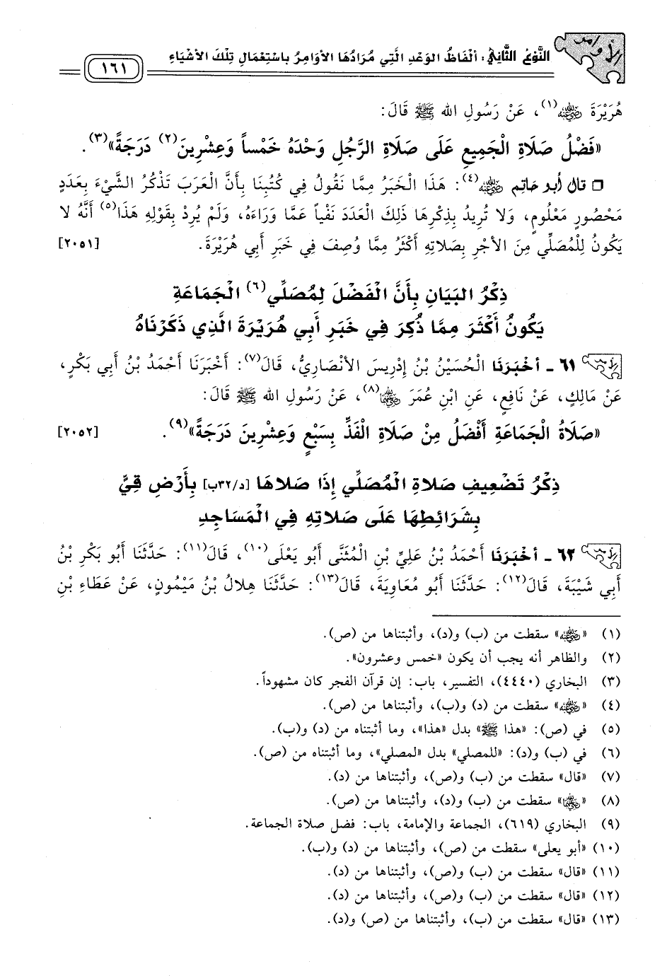 ٦١ - أَخبَرنا الْحُسَيْنُ بْنُ إِدْرِيسَ الأَنْصَارِيُّ، قال: أَخبَرنا أَحْمَدُ بْنُ أَبِي بَكْرٍ، عَنْ مَالِكٍ، عَنْ نَافِعٍ، عَنِ ابْنِ عُمَرَ رَضِيَ اللهُ عَنْهُما، عَنْ رَسُولِ اللهِ صَلى الله عَلَيه وسَلم قَالَ: "صَلَاةُ الْجَمَاعَةِ أَفْضَلُ مِنْ صَلَاةِ الْفَذِّ بِسَبْعٍ وَعِشْرِينَ دَرَجَةً". [٢٠٥٢]