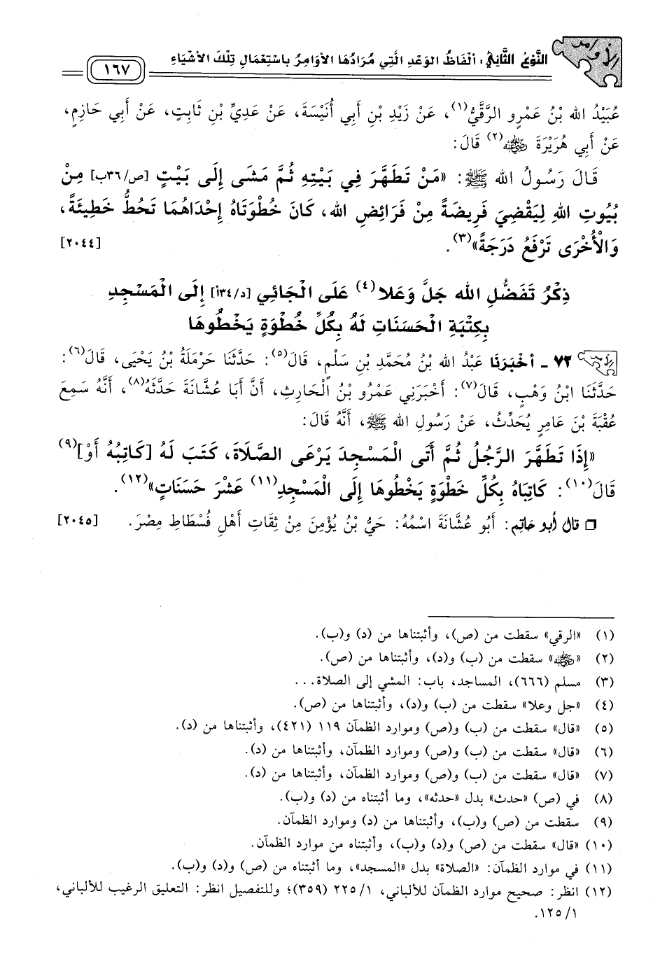 ٧١ - أَخبَرنا أَبُو يَعْلَى، قال: حَدثنا عَبْدُ الْجَبَّارِ بْنُ عَاصِمٍ، قال: حَدثنا عُبَيْدُ اللهِ بْنُ عَمْرٍو الرَّقِّيُّ، عَنْ زَيْدِ بْنِ أَبِي أُنَيْسَةَ، عَنْ عَدِيِّ بْنِ ثَابِتٍ، عَنْ أَبِي حَازِمٍ، عَنْ أَبِي هُرَيْرَةَ رَضِيَ اللهُ عَنْهُ، قَالَ: قَالَ رَسُولُ اللهِ صَلى الله عَلَيه وسَلم: "مَنْ تَطَهَّرَ فِي بَيْتِهِ، ثُمَّ مَشَى إِلَى بَيْتٍ مِنْ بُيُوتِ اللهِ لِيَقْضِيَ فَرِيضَةً مِنْ فَرَائِضِ اللهِ، كَانَ خَطْوَتَاهُ إِحْدَاهُمَا تَحُطُّ خَطِيئَةً وَالأُخْرَى تَرْفَعُ دَرَجَةً". [٢٠٤٤]