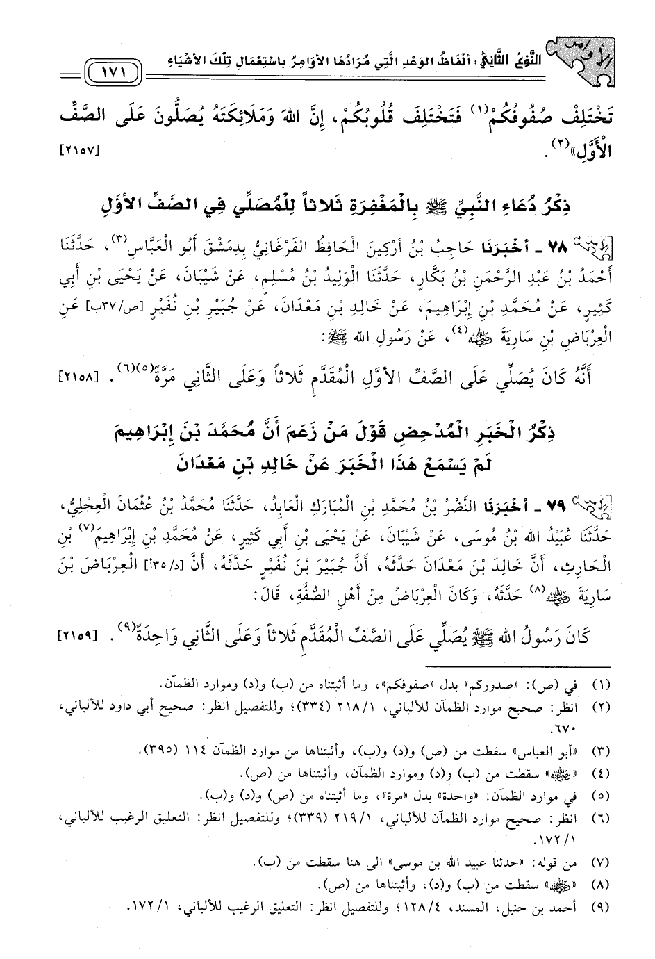 ٧٩ - أَخبَرنا النَّضْرُ بْنُ مُحَمَّدِ بْنِ الْمُبَارَكِ الْعَابِدُ، حَدثنا مُحَمَّدُ بْنُ عُثْمَانَ الْعِجْلِيُّ، حَدثنا عُبَيْدُ اللهِ بْنُ مُوسَى، عَنْ شَيْبَانَ، عَنْ يَحْيَى بْنِ أَبِي كَثِيرٍ، عَنْ مُحَمَّدِ بْنِ إِبْرَاهِيمَ بْنِ الْحَارِثِ، أَنَّ خَالِدَ بْنَ مَعْدَانَ، حَدَّثَهُ، أَنَّ جُبَيْرَ بْنَ نُفَيْرٍ، حَدَّثَهُ، أَنَّ الْعِرْبَاضَ بْنَ سَارِيَةَ رَضِيَ اللهُ عَنْهُ حَدَّثَهُ، وَكَانَ الْعِرْبَاضُ، مِنْ أَهْلِ الصُّفَّةِ، قَالَ: كَانَ رَسُولُ اللهِ صَلى الله عَلَيه وسَلم يُصَلِّي عَلَى الصَّفِّ الْمُقَدَّمِ ثَلَاثًا وَعَلَى الثَّانِي وَاحِدَةً. [٢١٥٩]