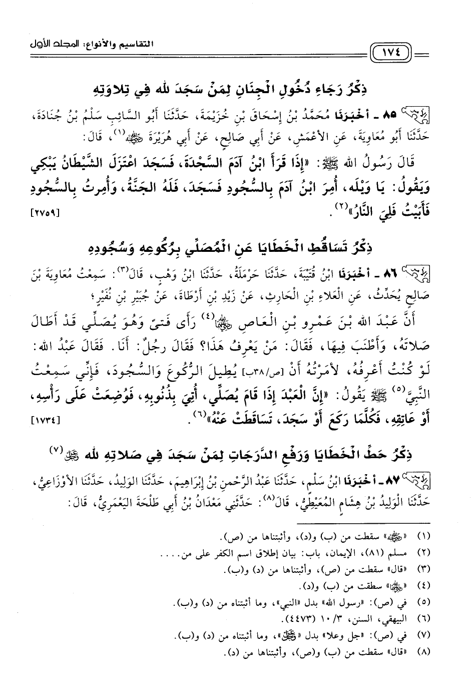 ذِكْرُ حَطِّ الْخَطَايَا وَرَفْعِ الدَّرَجَاتِ لِمَنْ سَجَدَ فِي صَلَاتِهِ للهِ عَزَّ وَجَلَّ.