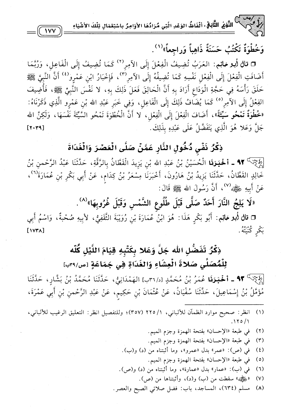 قَالَ أَبُو حَاتِمٍ: الْعَرَبُ تُضِيفُ الْفِعْلَ إِلَى الآمِرِ، كَمَا تُضِيفُ إِلَى الْفَاعِلِ، وَرُبَّمَا أَضَافَتِ الْفِعْلَ إِلَى الْفِعْلِ نَفْسِهِ كَمَا تُضِيفُهُ إِلَى الآمِرِ فَإِخْبَارُ ابْنِ عَمْرٍو أَنَّ النَّبِيَّ صَلى الله عَلَيه وسَلم حَلَقَ رَأْسَهُ فِي حَجَّةِ الْوَدَاعِ، أَرَادَ بِهِ أَنَّ الْحَالِقَ فَعَلَ ذَلِكَ بِهِ، لَا نَفْسُ النَّبِيِّ صَلى الله عَلَيه وسَلم، فَأُضِيفَ الْفِعْلُ إِلَى الآمِرِ، كَمَا يُضَافُ ذَلِكَ إِلَى الْفَاعِلِ، وَفِي خَبَرِ عَبْدِ اللهِ بْنِ عَمْرٍو، الَّذِي ذَكَرْنَاهُ: "خُطْوَةٌ تَمْحُو سَيِّئَةً"، أَضَافَ الْفِعْلَ إِلَى الْفِعْلِ، لَا أَنَّ الْخُطْوَةَ تَمْحُو السَّيِّئَةَ نَفْسَهَا، وَلَكِنَّ اللهَ جَلَّ وَعَلَا هُوَ الَّذِي يَتَفَضَّلُ عَلَى عَبْدِهِ بِذَلِكِ. [٢٠٣٩]