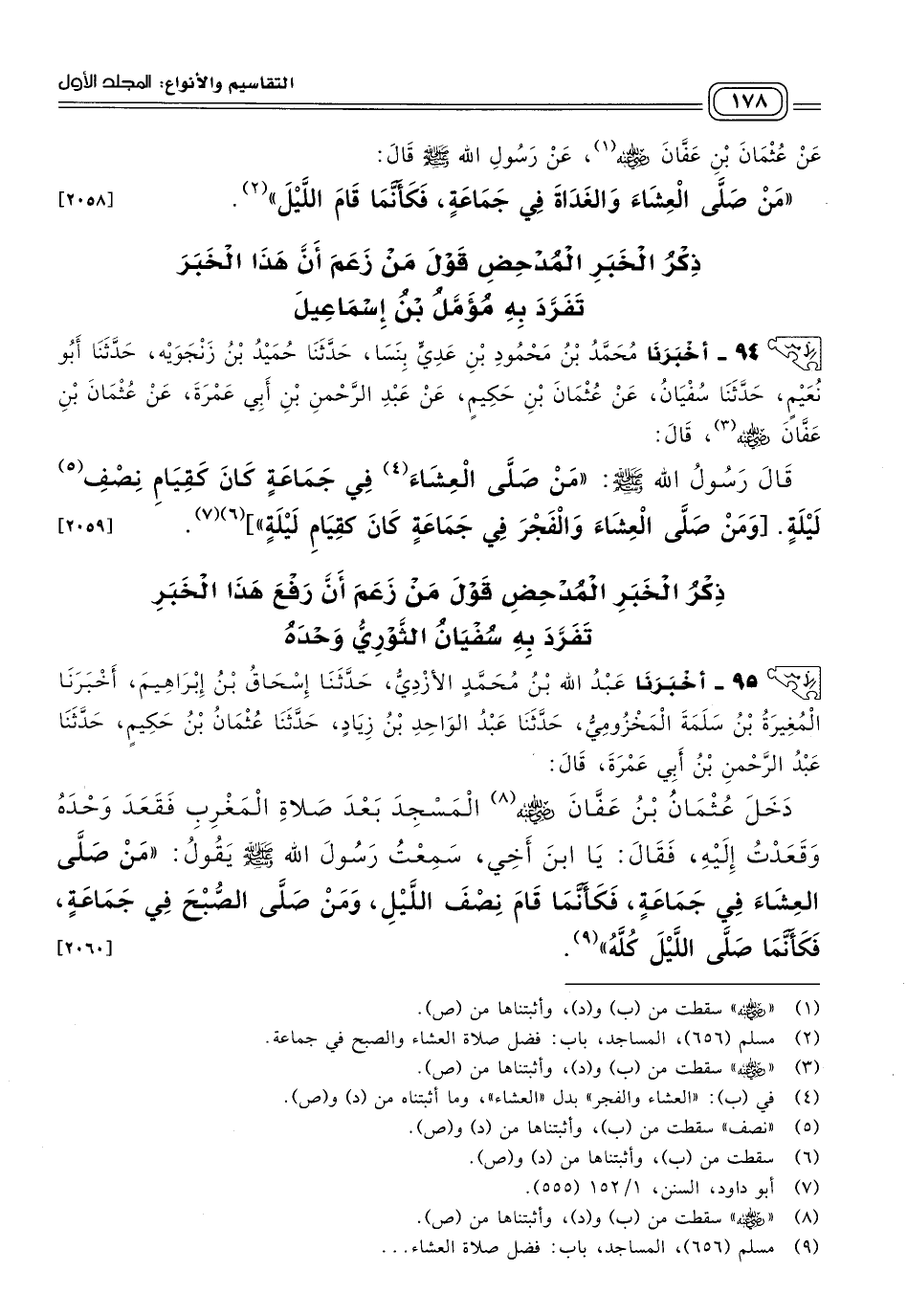 ٩٤ - أَخبَرنا مُحَمَّدُ بْنُ مَحْمُودِ بْنِ عَدِيٍّ بِنَسَا، حَدثنا حُمَيْدُ بْنُ زَنْجَوَيْهِ، حَدثنا أَبُو نُعَيْمٍ، حَدثنا سُفْيَانُ، عَنْ عُثْمَانَ بْنِ حَكِيمٍ، عَنْ عَبْدِ الرَّحْمَنِ بْنِ أَبِي عَمْرَةَ، عَنْ عُثْمَانَ بْنِ عَفَّانَ رَضِيَ اللهُ عَنْهُ، قَالَ: قَالَ رَسُولُ اللهِ صَلى الله عَلَيه وسَلم: "مَنْ صَلَّى الْعِشَاءَ فِي جَمَاعَةٍ كَانَ كَقِيَامِ نصف لَيْلَةٍ، [وَمَنْ صَلَّى الْعِشَاءَ وَالْفَجْرَ فِي جَمَاعَةٍ كَانَ كَقِيَامِ لَيْلَةٍ] ". [٢٠٥٩]