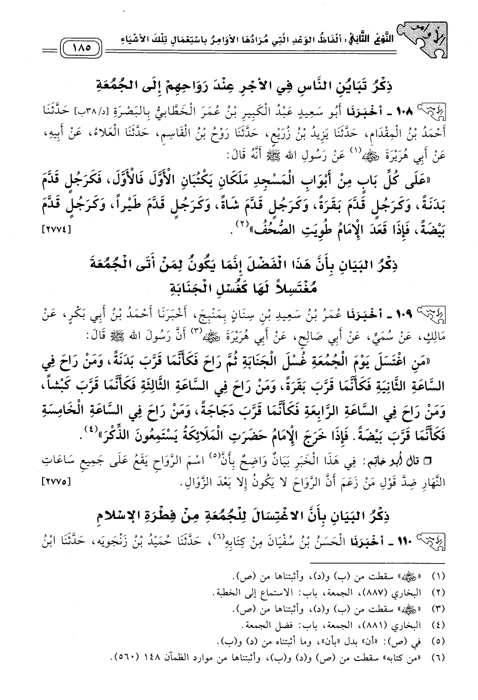 ١٠٩ - أَخبَرنا عُمَرُ بْنُ سَعِيدِ بْنِ سِنَانٍ، بِمَنْبِجَ، أَخبَرنا أَحْمَدُ بْنُ أَبِي بَكْرٍ، عَنْ مَالِكٍ، عَنْ سُمَيٍّ، عَنْ أَبِي صَالِحٍ، عَنْ أَبِي هُرَيْرَةَ رَضِيَ اللهُ عَنْهُ، أَنَّ رَسُولَ اللهِ صَلى الله عَلَيه وسَلم، قَالَ: "مَنِ اغْتَسَلَ يَوْمَ الْجُمُعَةِ غُسْلَ الْجَنَابَةِ، ثُمَّ رَاحَ فَكَأَنَّمَا قَرَّبَ بَدَنَةً، وَمَنْ رَاحَ فِي السَّاعَةِ الثَّانِيَةِ، فَكَأَنَّمَا قَرَّبَ بَقَرَةً، وَمَنْ رَاحَ فِي السَّاعَةِ الثَّالِثَةِ فَكَأَنَّمَا قَرَّبَ كَبْشًا، وَمَنْ رَاحَ فِي السَّاعَةِ الرَّابِعَةِ، فَكَأَنَّمَا قَرَّبَ دَجَاجَةً، وَمَنْ رَاحَ فِي السَّاعَةِ الْخَامِسَةِ، فَكَأَنَّمَا قَرَّبَ بَيْضَةً، فَإِذَا خَرَجَ الإِمَامُ حَضَرَتِ الْمَلَائِكَةُ يَسْتَمِعُونَ الذِّكْرَ".