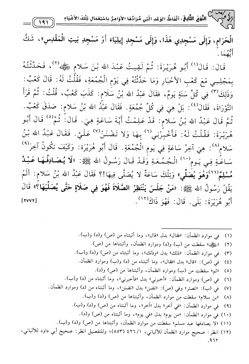 قَالَ: قَالَ أَبُو هُرَيْرَةَ: ثُمَّ لَقِيتُ عَبْدَ اللهِ بْنَ سَلَامٍ رَضِيَ اللهُ عَنْهُ، فَحَدَّثْتُهُ بِمَجْلِسِي مَعَ كَعْبِ الأَحْبَارِ، وَمَا حَدَّثَتْهُ فِي يَوْمِ الْجُمُعَةِ، فَقُلْتُ لَهُ: قَالَ كَعْبٌ: وَذَلِكَ فِي كُلِّ سَنَةٍ يَوْمٌ، فَقَالَ عَبْدُ اللهِ بْنُ سَلَامٍ: كَذَبَ كَعْبٌ، قُلْتُ: ثُمَّ قَرَأَ التَّوْرَاةَ، فَقَالَ: بَلْ هِيَ فِي كُلِّ جُمُعَةٍ، فَقَالَ عَبْدُ اللهِ بْنُ سَلَامٍ: صَدَقَ كَعْبٌ، ثُمَّ قَالَ عَبْدُ اللهِ بْنُ سَلَامٍ: قَدْ عَلِمْتُ أَيَّةَ سَاعَةٍ هِيَ؟ قَالَ: ثُمَّ قَالَ أَبُو هُرَيْرَةَ: فَقُلْتُ لَهُ: فَأَخْبِرْنِي بِهَا وَلَا تَضِنَّنَ عَلَيَّ، فَقَالَ عَبْدُ اللهِ بْنُ سَلَامٍ: هِيَ آخِرُ سَاعَةٍ فِي يَوْمِ الْجُمُعَةِ، قَالَ أَبُو هُرَيْرَةَ: وَكَيْفَ تَكُونُ آخِرَ سَاعَةٍ في يَوْمِ الْجُمُعَةِ، وَقَدْ قَالَ رَسُولُ اللهِ صَلى الله عَلَيه وسَلم: "لَا يُصَادِفُهَا عَبْدٌ مُسْلِمٌ وَهُوَ يُصَلِّي"، وَتِلْكَ سَاعَةٌ لَا يُصَلَّى فِيهَا!؟، فَقَالَ عَبْدُ اللهِ بْنُ سَلَامٍ: أَلَمْ يَقُلْ رَسُولُ اللهِ صَلى الله عَلَيه وسَلم: "مَنْ جَلَسَ يَنْتَظِرُ الصَّلَاةَ فَهُوَ فِي صَلَاةٍ، حَتَّى يُصَلِّيَهَا"، قَالَ أَبُو هُرَيْرَةَ: بَلَى، قَالَ: فَهُوَ ذَاكَ. [٢٧٧٢]