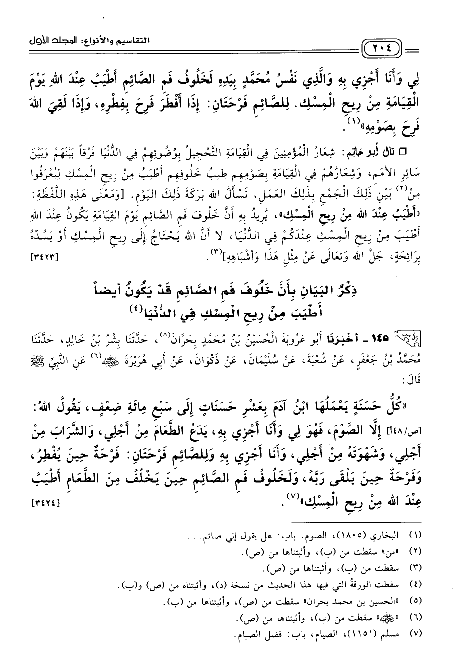 ١٤٥ - أَخبَرنا أَبُو عَرُوبَةَ الْحُسَيْنُ بْنُ مُحَمَّدٍ، بِحَرَّانَ، حَدثنا بِشْرُ بْنُ خَالِدٍ، حَدثنا مُحَمَّدُ بْنُ جَعْفَرٍ، عَنْ شُعْبَةَ، عَنْ سُلَيْمَانَ، عَنْ ذَكْوَانَ، عَنْ أَبِي هُرَيْرَةَ رَضِيَ اللهُ عَنْهُ، عَنِ النَّبِيِّ صَلى الله عَلَيه وسَلم، قَالَ: "كُلُّ حَسَنَةٍ يَعْمَلُهَا ابْنُ آدَمَ بِعَشْرِ حَسَنَاتٍ إِلَى سَبْعِ مِائَةِ ضِعْفٍ، يَقُولُ اللهُ: إِلَاّ الصَّوْمَ فَهُوَ لِي وَأَنَا أَجْزِي بِهِ، يَدَعُ الطَّعَامَ مِنْ أَجْلِي، وَالشَّرَابَ مِنْ أَجْلِي، وَشَهْوَتَهُ مِنْ أَجْلِي، وَأَنَا أَجْزِي بِهِ، وَلِلصَّائِمِ فَرْحَتَانِ: فَرْحَةٌ حِينَ يُفْطِرُ، وَفَرْحَةٌ حِينَ يَلْقَى رَبَّهُ، وَلَخَلُوفِ فَمِ الصَّائِمِ حِينَ يَخْلُفُ مِنَ الطَّعَامِ أَطْيَبُ عِنْدَ اللهِ مِنْ رِيحِ الْمِسْكِ. [٣٤٢٤]