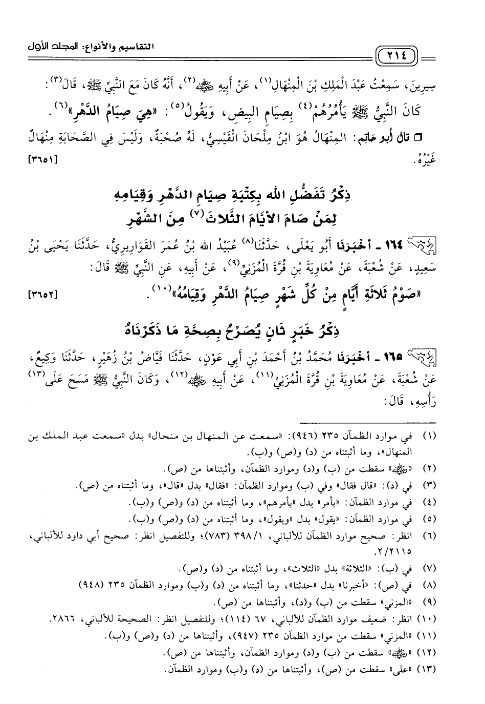 ١٦٥ - أَخبَرنا مُحَمَّدُ بْنُ أَحْمَدَ بْنِ أَبِي عَوْنٍ، حَدثنا فَيَّاضُ بْنُ زُهَيْرٍ، حَدثنا وَكِيعٌ، عَنْ شُعْبَةَ، عَنْ مُعَاوِيَةَ بْنِ قُرَّةَ الْمُزَنِيِّ، عَنْ أَبِيهِ رَضِيَ اللهُ عَنْهُ، وَكَانَ النَّبِيُّ صَلى الله عَلَيه وسَلم مَسَحَ عَلَى رَأْسِهِ، قَالَ: قَالَ رَسُولُ اللهِ صَلى الله عَلَيه وسَلم: "صِيَامُ ثَلَاثَةِ أَيَّامٍ مِنْ كُلِّ شَهْرٍ صِيَامُ الدَّهْرِ وَإِفْطَارُهُ".