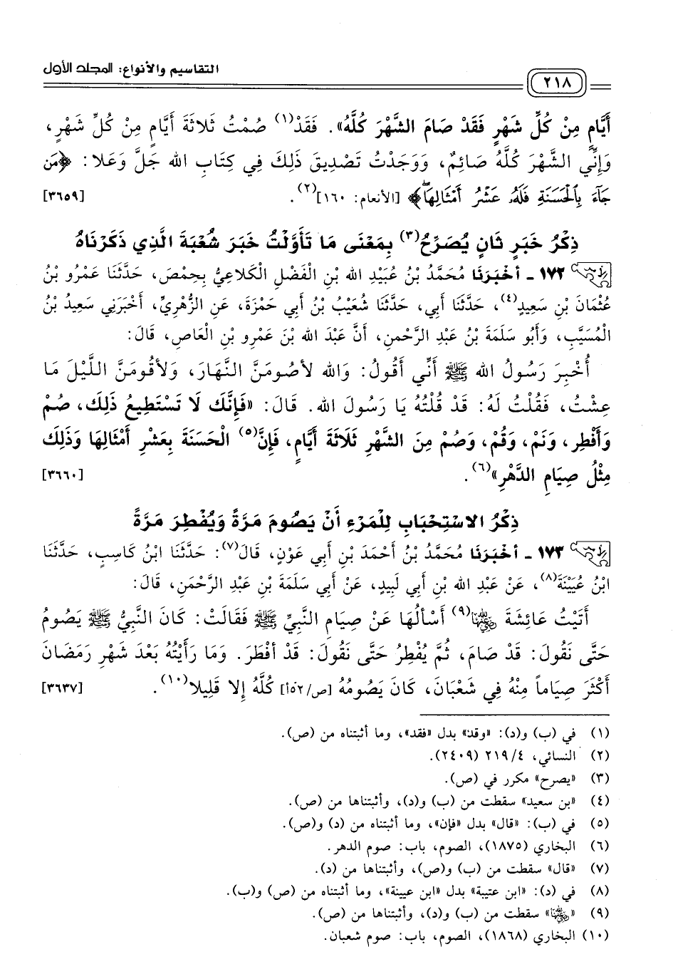 ١٧٢ - أَخبَرنا مُحَمَّدُ بْنُ عُبَيْدِ اللهِ بْنِ الْفَضْلِ الْكَلَاعِيُّ، بِحِمْصَ، حَدثنا عَمْرُو بْنُ عُثْمَانَ بن سعيد، حَدثنا أَبِي، حَدثنا شُعَيْبُ بْنُ أَبِي حَمْزَةَ، عَنِ الزُهْرِيِّ، أَخْبَرَنِي سَعِيدُ بْنُ الْمُسَيَّبِ، وَأَبُو سَلَمَةَ بْنُ عَبْدِ الرَّحْمَنِ، أَنَّ عَبْدَ اللهِ بْنَ عَمْرِو بْنِ الْعَاصِ، قَالَ: أُخْبِرَ رَسُولُ اللهِ صَلى الله عَلَيه وسَلم أَنِّي أَقُولُ: وَاللهِ لأَصُومَنَّ النَّهَارَ وَلأَقُومَنَّ اللَّيْلَ مَا عِشْتُ، فَقُلْتُ لَهُ: قَدْ قُلْتُهُ يَا رَسُولَ اللهِ، قَالَ: "فَإِنَّكَ لَا تَسْتَطِيعُ ذَلِكَ، صُمْ وَأَفْطِرْ، وَنَمْ وَقُمْ، وَصُمْ مِنَ الشَّهْرِ ثَلَاثَةَ أَيَّامٍ فَإِنَّ الْحَسَنَةَ بِعَشْرِ أَمْثَالِهَا، وَذَلِكَ مِثْلُ صِيَامِ الدَّهْرِ". [٣٦٦٠]