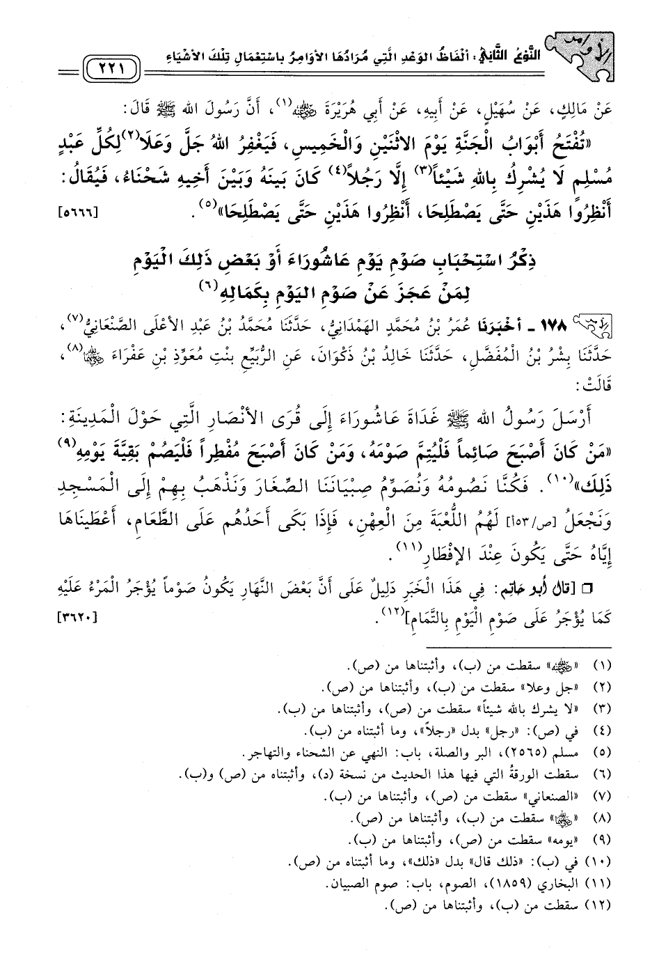 ١٧٨ - أَخبَرنا عُمَرُ بْنُ مُحَمَّدٍ الْهَمْدَانِيُّ، حَدثنا مُحَمَّدُ بْنُ عَبْدِ الأَعْلَى الصَّنْعَانِيُّ، حَدثنا بِشْرُ بْنُ الْمُفَضَّلِ، حَدثنا خَالِدُ بْنُ ذَكْوَانَ، عَنِ الرُّبَيِّعِ بِنْتِ مُعَوِّذِ بْنِ عَفْرَاءَ رَضِيَ اللهُ عَنْهُما، قَالَتْ: أَرْسَلَ رَسُولُ اللهِ صَلى الله عَلَيه وسَلم غَدَاةَ عَاشُورَاءَ إِلَى قُرَى الأَنْصَارِ الَّتِي حَوْلَ الْمَدِينَةِ: "مَنْ كَانَ أَصْبَحَ صَائِمًا فَلْيُتِمَّ صَوْمَهُ، وَمَنْ كَانَ أَصْبَحَ مُفْطِرًا فَلْيَصُمْ بَقِيَّةَ يَوْمِهِ ذَلِكَ"، فَكُنَّا نَصُومُهُ وَنُصَوِّمُ صِبْيَانَنَا الصِّغَارَ وَنَذْهَبُ بِهِمْ إِلَى الْمَسْجِدِ، وَنَجْعَلُ لَهُمُ اللُّعْبَةَ مِنَ الْعِهْنِ، فَإِذَا بَكَى أَحَدُهُمْ عَلَى الطَّعَامِ أَعْطَيْنَاهَا إِيَّاهُ حَتَّى يَكُونَ عِنْدَ الإِفْطَارِ.