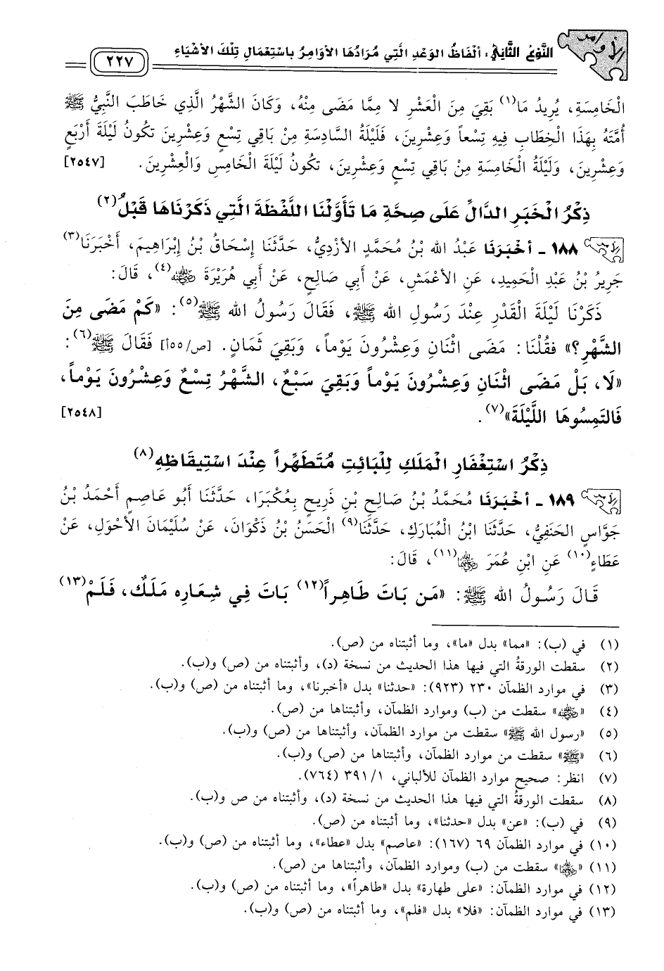 ١٨٨ - أَخبَرنا عَبْدُ اللهِ بْنُ مُحَمَّدٍ الأَزْدِيُّ، حَدثنا إِسْحَاقُ بْنُ إِبْرَاهِيمَ، أَخبَرنا جَرِيرُ بْنُ عَبْدِ الْحَمِيدِ، عَنِ الأَعْمَشِ، عَنْ أَبِي صَالِحٍ، عَنْ أَبِي هُرَيْرَةَ رَضِيَ اللهُ عَنْهُ قَالَ: ذَكَرْنَا لَيْلَةَ الْقَدْرِ عِنْدَ رَسُولِ اللهِ صَلى الله عَلَيه وسَلم، فَقَالَ رَسُولُ اللهِ صَلى الله عَلَيه وسَلم: "كَمْ مَضَى مِنَ الشَّهْرِ؟ " فَقُلْنَا: مَضَى اثْنَانِ وَعِشْرُونَ يَوْمًا، وَبَقِيَ ثَمَانٌ، فَقَالَ صَلى الله عَلَيه وسَلم: "لَا، بَلْ مَضَى اثْنَانِ وَعِشْرُونَ يَوْمًا، وَبَقِيَ سَبْعٌ، الشَّهْرُ تِسْعٌ وَعِشْرُونَ يَوْمًا، فَالْتَمِسُوهَا اللَّيْلَةَ". [٢٥٤٨]
