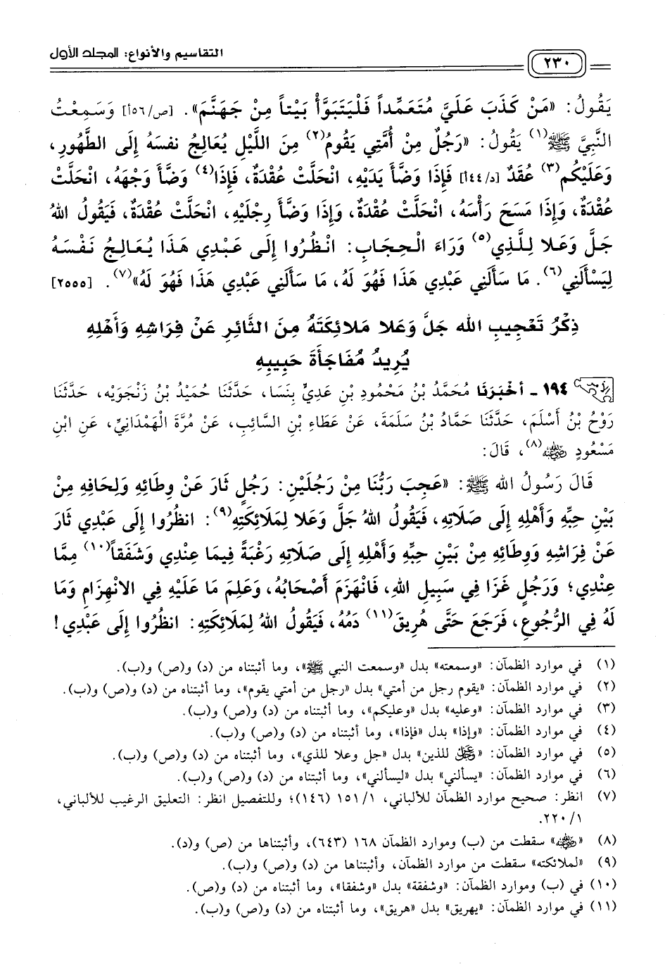 ١٩٤ - أَخبَرنا مُحَمَّدُ بْنُ مَحْمُودِ بْنِ عَدِيٍّ بِنَسَا، حَدثنا حُمَيْدُ بْنُ زَنْجَوَيْهِ، حَدثنا رَوْحُ بْنُ أَسْلَمَ، حَدثنا حَمَّادُ بْنُ سَلَمَةَ، عَنْ عَطَاءِ بْنِ السَّائِبِ، عَنْ مُرَّةَ الْهَمْدَانِيِّ، عَنِ ابْنِ مَسْعُودٍ رَضِيَ اللهُ عَنْهُ، قَالَ: قَالَ رَسُولُ اللهِ صَلى الله عَلَيه وسَلم: "عَجِبَ رَبُّنَا مِنْ رَجُلَيْنِ: رَجُلٍ ثَارَ عَنْ وِطَائِهِ وَلِحَافِهِ مِنْ بَيْنَ حِبِّهِ وَأَهْلِهِ إِلَى صَلَاتِهِ، فَيَقُولُ اللهُ جَلَّ وَعَلَا لِمَلَائِكَتِهِ: انْظُرُوا إِلَى عَبْدِي، ثَارَ عَنْ فِرَاشِهِ وَوِطَائِهِ مِنْ بَيْنَ حِبِّهِ وَأَهْلِهِ إِلَى صَلَاتِهِ رَغْبَةً فِيمَا عِنْدِي، وَشَفَقا مِمَّا عِنْدِي، وَرَجُلٍ غَزَا فِي سَبِيلِ اللهِ، فَانْهَزَمَ أَصْحَابُهُ، وَعَلِمَ مَا عَلَيْهِ فِي الاِنْهِزَامِ، وَمَا لَهُ فِي الرُّجُوعِ، فَرَجَعَ حَتَّى هُرِيقَ دَمُهُ، فَيَقُولُ اللهُ لِمَلَائِكَتِهِ: انْظُرُوا إِلَى عَبْدِي، رَجَعَ رَجَاءً فِيمَا عِنْدِي، وَشَفَقًا مِمَّا عِنْدِي حَتَّى هُرِيقَ دَمُهُ". [٢٥٥٨]