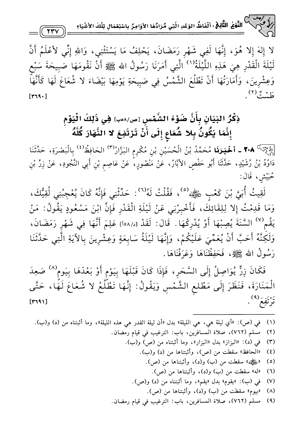 ٢٠٨ - أَخبَرنا مُحَمَّدُ بْنُ الْحُسَيْنِ بْنِ مُكْرَمٍ الْبَزَّارُ الْحَافِظُ، بِالْبَصْرَةِ، حَدثنا دَاوُدُ بْنُ رُشَيْدٍ، حَدثنا أَبُو حَفْصٍ الأَبَّارُ، عَنْ مَنْصُورٍ، عَنْ عَاصِمِ بْنِ أَبِي النَّجُودِ، عَنْ زِرِّ بْنِ حُبَيْشٍ، قَالَ: لَقِيتُ أُبَيَّ بْنَ كَعْبٍ رَضِيَ اللهُ عَنْهُ، فَقُلْتُ له: حَدِّثْنِي فَإِنَّهُ كَانَ يُعْجِبُنِي لُقِيُّكَ وَمَا قَدِمْتُ إِلَاّ لِلِقَائِكَ، فَأَخْبِرْنِي عَنْ لَيْلَةِ الْقَدْرِ، فَإِنَّ ابْنَ مَسْعُودٍ، يَقُولُ: مَنْ يَقُمِ السَّنَةَ يُصِبْهَا، أَوْ يُدْرِكْهَا، قَالَ: لَقَدْ عَلِمَ أَنَّهَا فِي شَهْرِ رَمَضَانَ، وَلَكِنَّهُ أَحَبَّ أَنْ يُعَمِّيَ عَلَيْكُمْ، وَإِنَّهَا لَيْلَةُ سَابِعَةٍ وَعِشْرِينَ بِالآيَةِ الَّتِي حَدثنا رَسُولُ اللهِ صَلى الله عَلَيه وسَلم فَحَفِظْنَاهَا وَعَرَفْنَاهَا، فَكَانَ زِرٌّ يُوَاصِلُ إِلَى السَّحَرِ، فَإِذَا كَانَ قَبْلَهَا بِيَوْمٍ، أَوْ بَعْدَهَا بيوم صَعِدَ الْمَنَارَةَ، فَنَظَرَ إِلَى مَطْلِعِ الشَّمْسِ، وَيَقُولُ: إِنَّهَا تَطْلُعُ لَا شُعَاعَ لَهَا حَتَّى تَرْتَفِعَ. [٣٦٩١]