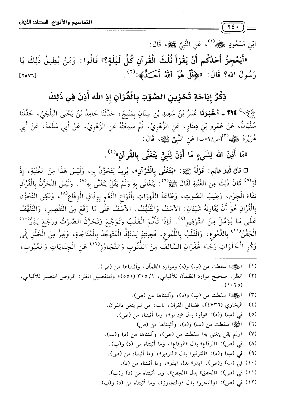 قَالَ أَبُو حَاتِمٍ: قَوْلُهُ صَلى الله عَلَيه وسَلم: "يَتَغَنَّى بِالْقُرْآنِ"، يُرِيدُ يَتَحَزَّنُ بِهِ، وَلَيْسَ هَذَا مِنَ الْغُنْيَةِ، إذ لَوْ كَانَ ذَلِكَ مِنَ الْغُنْيَةِ لَقَالَ صلى الله عليه وسلم: يَتَغَانَى بِهِ، وَلَمْ يَقُلْ: يَتَغَنَّى بِهِ، وَلَيْسَ التَّحَزُّنُ بِالْقُرْآنِ نَقَاءَ الْجِرْمِ، وَطِيبَ الصَّوْتِ، وَطَاعَةَ اللهَوَاتِ بِأَنْوَاعِ النَّغَمِ بِوِفَاقِ الْوِقَاعِ، وَلَكِنَّ التَّحَزُّنَ بِالْقُرْآنِ هُوَ أَنْ يُقَارِنَهُ شَيْئَانِ: الأَسَفُ وَالتَّلَهُّفُ: الأَسَفُ عَلَى مَا وَقَعَ مِنَ التَّقْصِيرِ، وَالتَّلَهُّفُ عَلَى مَا يُؤْمَلُ مِنَ التَّوْفِيرِ، فَإِذَا تَأَلَّمَ الْقَلْبُ وَتَوَجَّعَ، وَتَحَزَّنَ الصَّوْتُ وَرَجَّعَ، يَذِرُّ الْجَفْنُ بِالدِّمُوعِ، وَالْقَلْبُ بِاللُّمُوعِ، فَحِينَئِذٍ يَسْتَلِذُّ الْمُتَهَجِّدُ بِالْمُنَاجَاةِ، وَيَفِرُّ مِنَ الْخَلْقِ إِلَى وَكْرِ الْخَلَوَاتِ، رَجَاءَ غُفْرَانِ السَّالِفِ مِنَ الذُّنُوبِ، وَالتَّجَاوُزِ عَنِ الْجِنَايَاتِ وَالْعُيُوبِ، فَنَسْأَلُ اللهَ التَّوْفِيقَ لَهُ. [٧٥١]