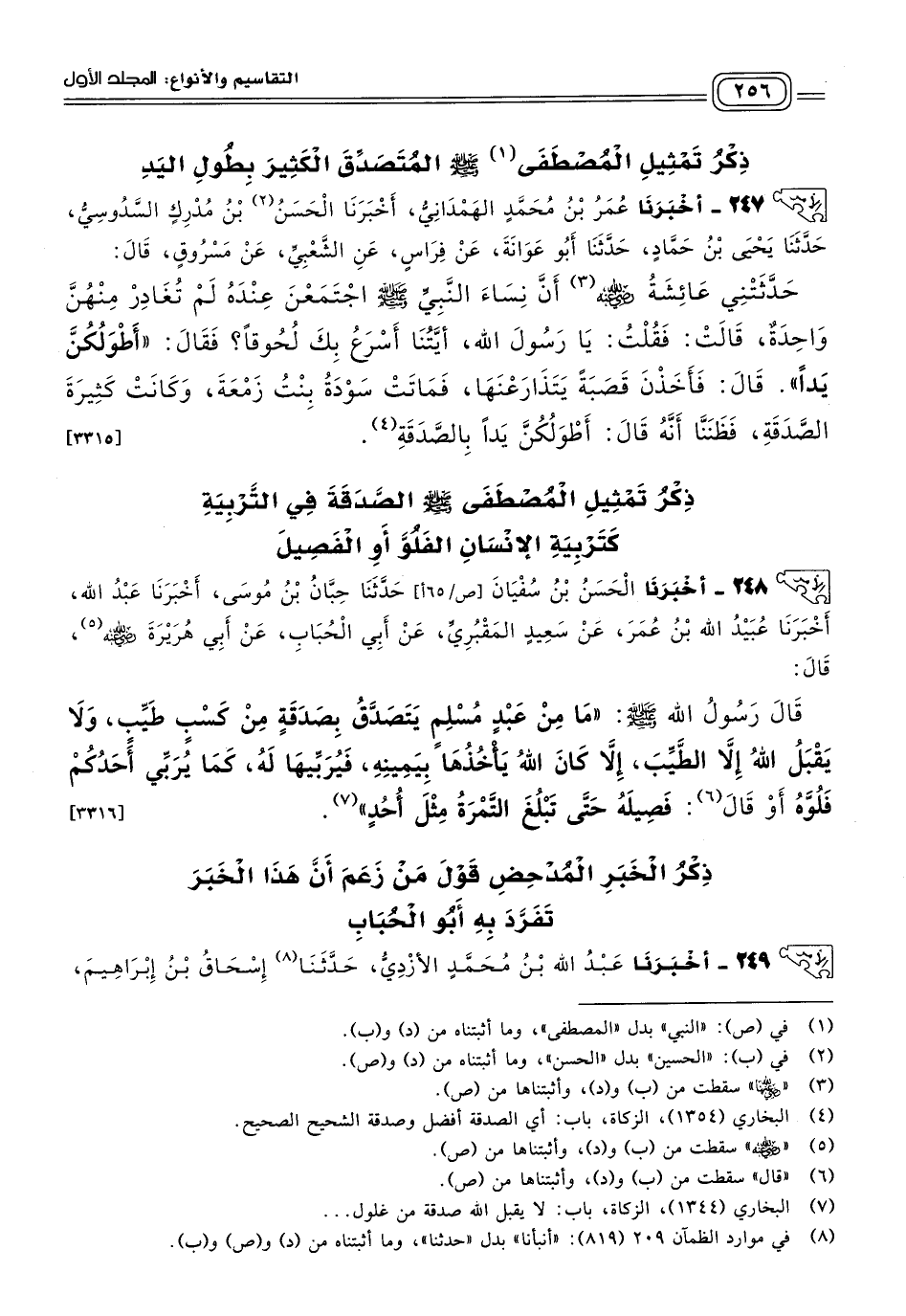 ٢٤٩ - أَخبَرنا عَبْدُ اللهِ بْنُ مُحَمَّدٍ الأَزْدِيُّ، حَدثنا إِسْحَاقُ بْنُ إِبْرَاهِيمَ، أَخبَرنا عَبْدُ الصَّمَدِ، حَدثنا حَمَّادُ بْنُ سَلَمَةَ، عَنْ ثَابِتٍ الْبُنَانِيِّ، عَنِ الْقَاسِمِ بْنِ مُحَمَّدٍ، عَنْ عَائِشَةَ رَضِيَ اللهُ عَنْها، عَنْ رَسُولِ اللهِ صَلى الله عَلَيه وسَلم، قَالَ: "إِنَّ اللهَ لَيُرَبِّي لأَحَدِكُمُ التَّمْرَةَ وَاللُّقْمَةَ كَمَا يُرَبِّي أَحَدُكُمْ فَلُوَّهُ، أَوْ فَصِيلَهُ حَتَّى يَكُونَ مِثْلَ أُحُدٍ. [٣٣١٧]
