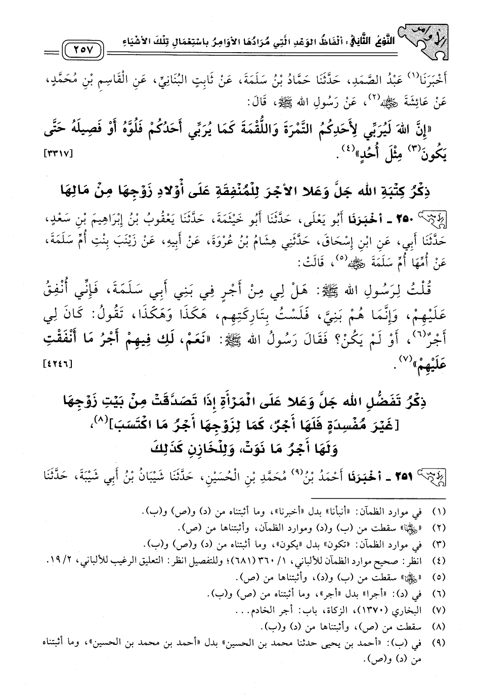 ٢٥٠ - أَخبَرنا أَبُو يَعْلَى، حَدثنا أَبُو خَيْثَمَةَ، حَدثنا يَعْقُوبُ بْنُ إِبْرَاهِيمَ بْنِ سَعْدٍ، حَدثنا أَبِي، عَنِ ابْنِ إِسْحَاقَ، حَدَّثَنِي هِشَامُ بْنُ عُرْوَةَ، عَنْ أَبِيهِ، عَنْ زَيْنَبَ بِنْتِ أُمِّ سَلَمَةَ، عَنْ أُمِّهَا أُمِّ سَلَمَةَ رَضِيَ اللهُ عَنْها، قَالَتْ: قُلْتُ لِرَسُولِ اللهِ صَلى الله عَلَيه وسَلم: هَلْ لِي مِنْ أَجْرٍ فِي بَنِي أَبِي سَلَمَةَ فَإِنِّي أُنْفِقُ عَلَيْهِمْ، وَإِنَّمَا هُمْ بَنِيَّ، فَلَسْتُ بِتَارِكَتِهِمْ هَكَذَا، وَهَكَذَا تَقُولُ: كَانَ لِي أَجْرٌ، أَوْ لَمْ يَكُنْ؟ فَقَالَ رَسُولُ اللهِ صَلى الله عَلَيه وسَلم: "نَعَمْ لَكِ فِيهِمْ أَجْرٌ مَا أَنْفَقْتِ عَلَيْهِمْ". [٤٢٤٦]