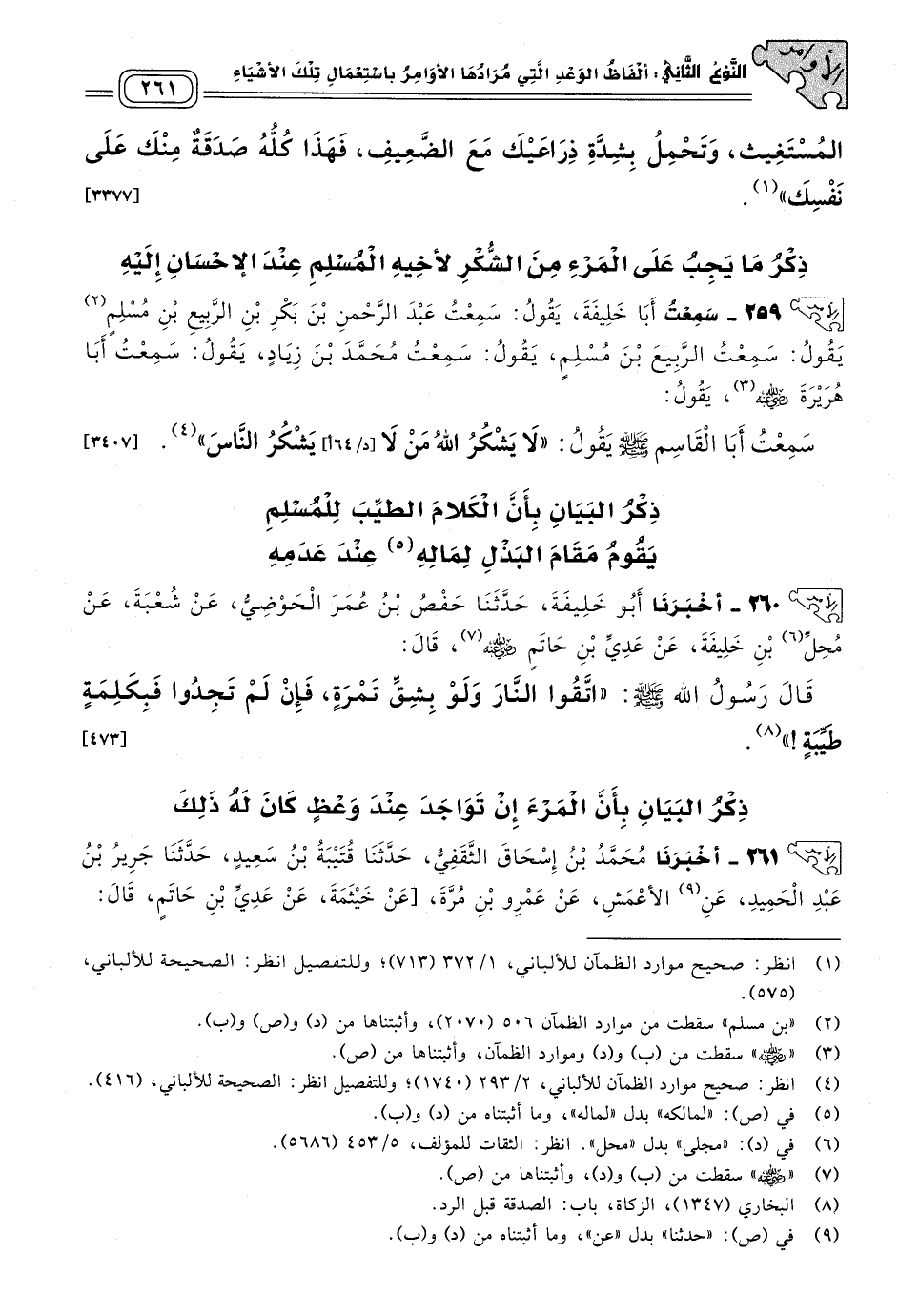 ٢٦١ - أَخبَرنا مُحَمَّدُ بْنُ إِسْحَاقَ الثَّقَفِيُّ، حَدثنا قُتَيْبَةُ بْنُ سَعِيدٍ، حَدثنا جَرِيرُ بْنُ عَبْدِ الْحَمِيدِ، عَنِ الأَعْمَشِ، عَنْ عَمْرِو بْنِ مُرَّةَ، عَنْ خَيْثَمَةَ، عَنْ عَدِيِّ بْنِ حَاتِمٍ، قَالَ: قَامَ النَّبِيُّ صَلى الله عَلَيه وسَلم، فقَالَ: "اتَّقُوا النَّارَ" ثُمَّ أَعْرَضَ وَأَشَاحَ، قال: ثُمَّ قَالَ: "اتَّقُوا النَّارَ"، ثُمَّ أَعْرَضَ وَأَشَاحَ، حَتَّى رُئِينَا أَنَّهُ يَرَاهَا، ثُمَّ قَالَ: "اتَّقُوا النَّارَ وَلَوْ بِشِقِّ تَمْرَةٍ، فَإِنْ لَمْ تَجِدُوا فَبِكَلِمَةٍ طَيْبَةٍ". [٢٨٠٤]