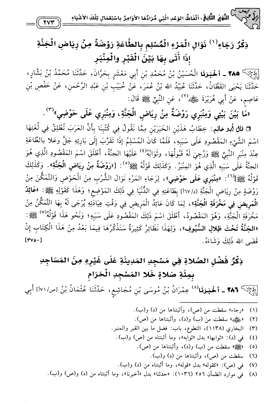 ٢٨٥ - أَخبَرنا الْحُسَيْنُ بْنُ مُحَمَّدِ بْنِ أَبِي مَعْشَرٍ بِحَرَّانَ، حَدثنا مُحَمَّدُ بْنُ بَشَّارٍ، حَدثنا يَحْيَى الْقَطَّانُ، حَدثنا عُبَيْدُ اللهِ بْنُ عُمَرَ، عَنْ خُبَيْبِ بْنِ عَبْدِ الرَّحْمَنِ، عَنْ حَفْصِ بْنِ عَاصِمٍ، عَنْ أَبِي هُرَيْرَةَ رَضِيَ اللهُ عَنْهُ، عَنِ النَّبِيِّ صَلى الله عَلَيه وسَلم قَالَ: "مَا بَيْنَ بَيْتِي وَمِنْبَرِي رَوْضَةٌ مِنْ رِيَاضِ الْجَنَّةِ، وَمِنْبَرِي عَلَى حَوْضِي".