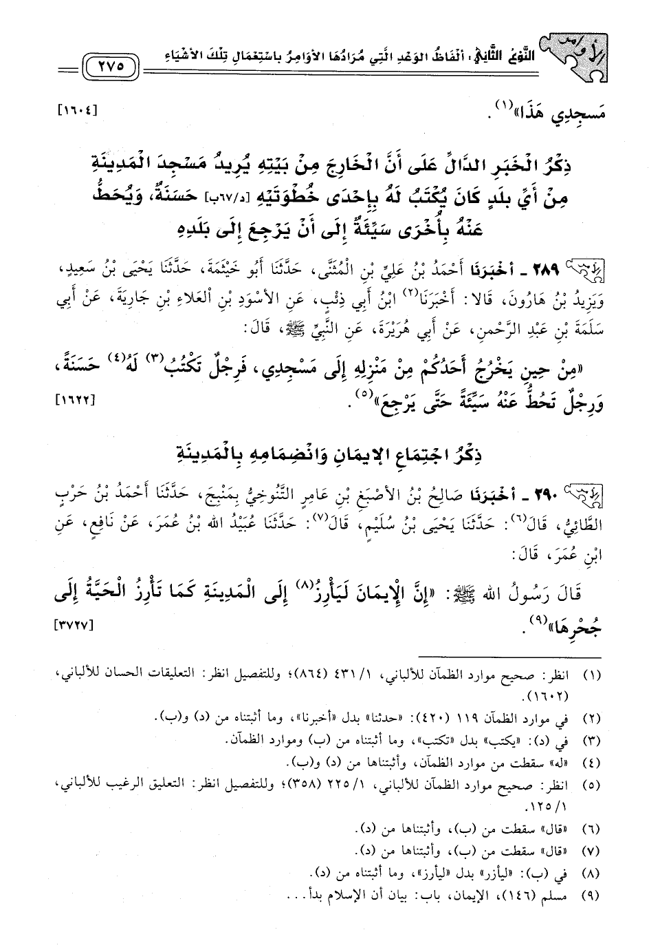 ٢٨٩ - أَخبَرنا أَحْمَدُ بْنُ عَلِيِّ بْنِ الْمُثَنَّى، حَدثنا أَبُو خَيْثَمَةَ، حَدثنا يَحْيَى بْنُ سَعِيدٍ، وَيَزِيدُ بْنُ هَارُونَ، قَالَا: أَخبَرنا ابْنُ أَبِي ذِئْبٍ، عَنِ الأَسْوَدِ بْنِ الْعَلَاءِ بْنِ جَارِيَةَ، عَنْ أَبِي سَلَمَةَ بْنِ عَبْدِ الرَّحْمَنِ، عَنْ أَبِي هُرَيْرَةَ، عَنِ النَّبِيِّ صَلى الله عَلَيه وسَلم، قَالَ: "مِنْ حِينِ يَخْرُجُ أَحَدُكُمْ مِنْ مَنْزِلِهِ إِلَى مَسْجِدِي، فَرِجْلٌ تَكْتُبُ لَهُ حَسَنَةً، وَرِجْلٌ تَحُطُّ عَنْهُ سَيِّئَةً حَتَّى يَرْجِعَ". [١٦٢٢]