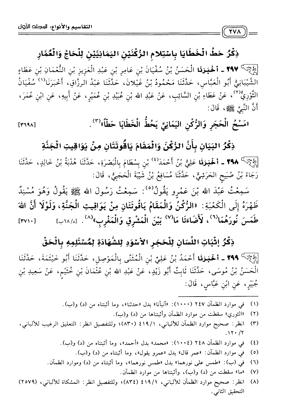 ٢٩٨ - أَخبَرنا عَلِيُّ بْنُ أَحْمَدَ بْنِ بِسْطَامٍ بِالْبَصْرَةَ، حَدثنا هُدْبَةُ بْنُ خَالِدٍ، حَدثنا رَجَاءُ بْنُ صَبِيْحٍ الْحَرَشِيُّ، حَدثنا مُسَافِعُ بْنُ شَيْبَةَ الْحَجَبِيُّ، قَالَ: سَمِعْتُ عَبْدَ اللهِ بْنَ عَمْرٍو يَقُولُ: سَمِعْتُ رَسُولَ اللهِ صَلى الله عَلَيه وسَلم يَقُولُ وَهُوَ مُسْنِدٌ ظَهْرَهُ إِلَى الْكَعْبَةِ: "الرُّكْنُ وَالْمَقَامُ يَاقُوتَتَانِ مَنْ يَوَاقِيتِ الْجَنَّةِ، وَلَوْلَا أَنَّ اللهَ طَمَسَ نُورَهُمَا لأَضَاءَتَا مَا بَيْنَ الْمَشْرِقِ وَالْمَغْرِبِ". [٣٧١٠]