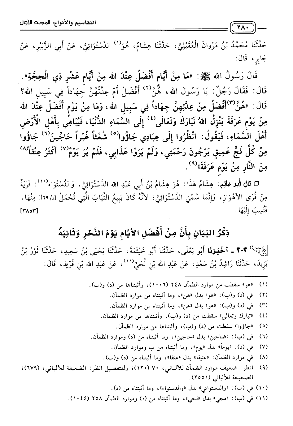 ٣٠٣ - أَخبَرنا أَبُو يَعْلَى، حَدثنا أَبُو خَيْثَمَةَ، حَدثنا يَحْيَى بْنُ سَعِيدٍ، حَدثنا ثَوْرُ بْنُ يَزِيدَ، حَدثنا رَاشِدُ بْنُ سَعْدٍ، عَنْ عَبْدِ اللهِ بْنِ لُحَيٍّ، عَنْ عَبْدِ اللهِ بْنِ قُرْطٍ، قَالَ: قَالَ رَسُولُ اللهِ صَلى الله عَلَيه وسَلم: "أَفْضَلُ الأَيَّامِ عِنْدَ اللهِ تعالى يَوْمُ النَّحْرِ، وَيَوْمُ الْقَرِّ". [٢٨١١]