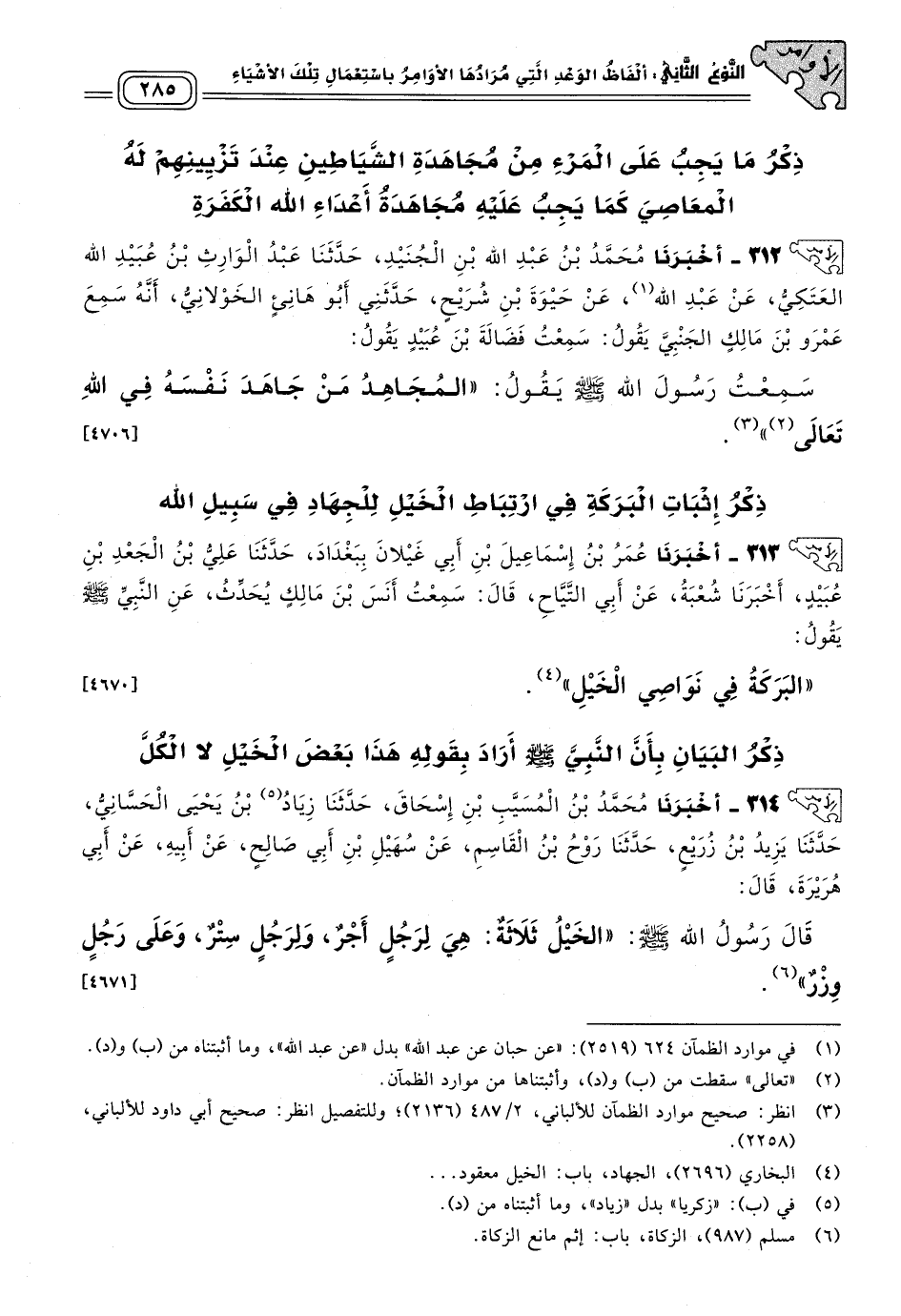 ٣١٢ - أَخبَرنا مُحَمَّدُ بْنُ عَبْدِ اللهِ بْنِ الْجُنَيْدِ، حَدثنا عَبْدُ الْوَارِثِ بْنُ عُبَيْدِ اللهِ الْعَتَكِيُّ، عَنْ عَبْدِ اللهِ، عَنْ حَيْوَةَ بْنِ شُرَيْحٍ، حَدَّثَنِي أَبُو هَانِئٍ الْخَوْلَانِيُّ، أَنَّهُ سَمِعَ عَمْرَو بْنَ مَالِكٍ الْجَنْبِيَّ، يَقُولُ: سَمِعْتُ فَضَالَةَ بْنَ عُبَيْدٍ، يَقُولُ: سَمِعْتُ رَسُولَ اللهِ صَلى الله عَلَيه وسَلم يَقُولُ: "الْمُجَاهِدُ مَنْ جَاهَدَ نَفْسَهُ فِي اللهِ تعالى". [٤٧٠٦]