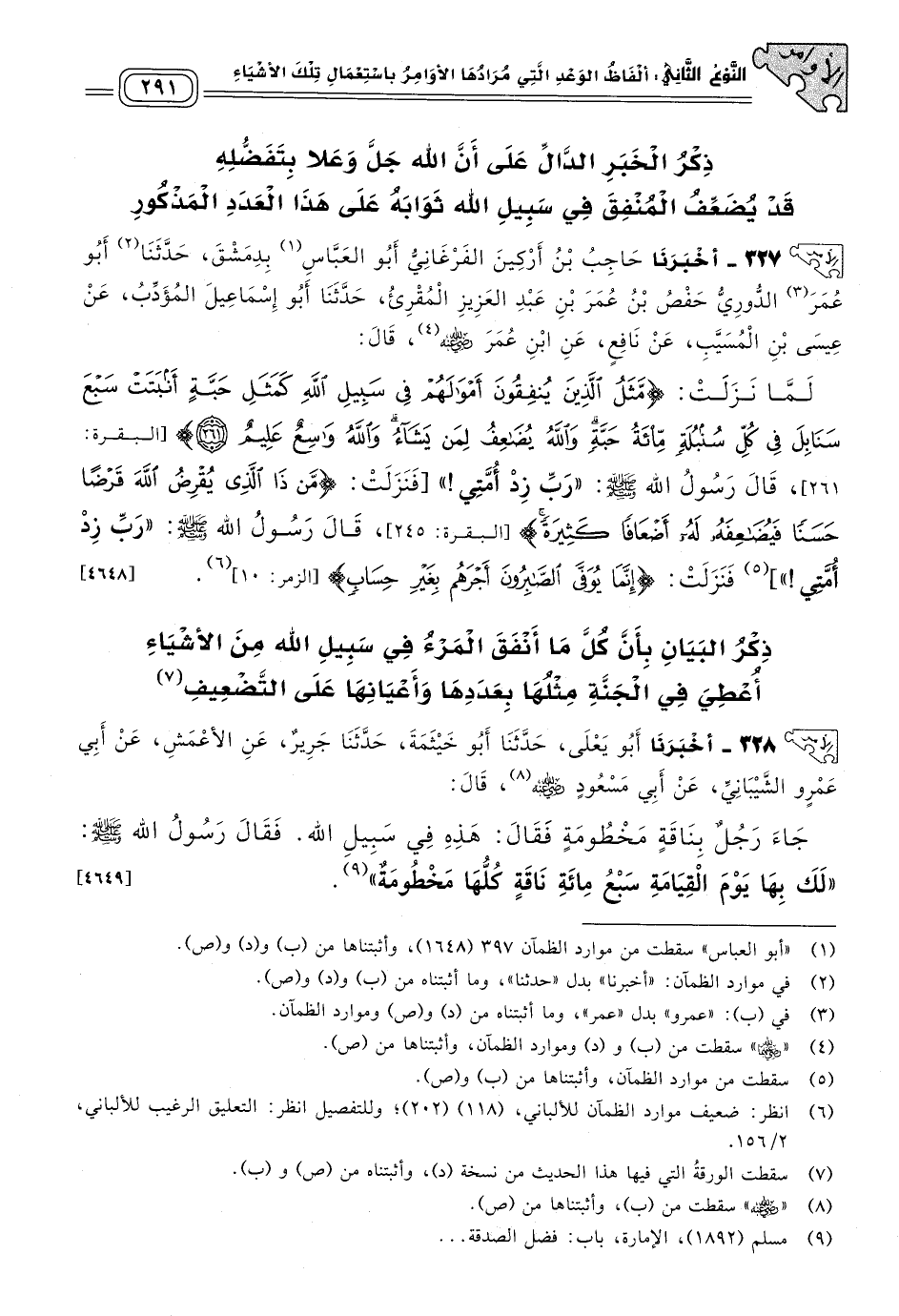 ذِكْرُ الْخَبَرِ الدَّالِّ عَلَى أَنَّ اللهَ جَلَّ وَعَلَا بِتَفَضُّلِهِ قَدْ يُضَعِّفُ الْمُنْفِقَ فِي سَبِيلِ اللهِ ثَوَابَهُ عَلَى هَذَا الْعَدَدِ الْمَذْكُورِ.