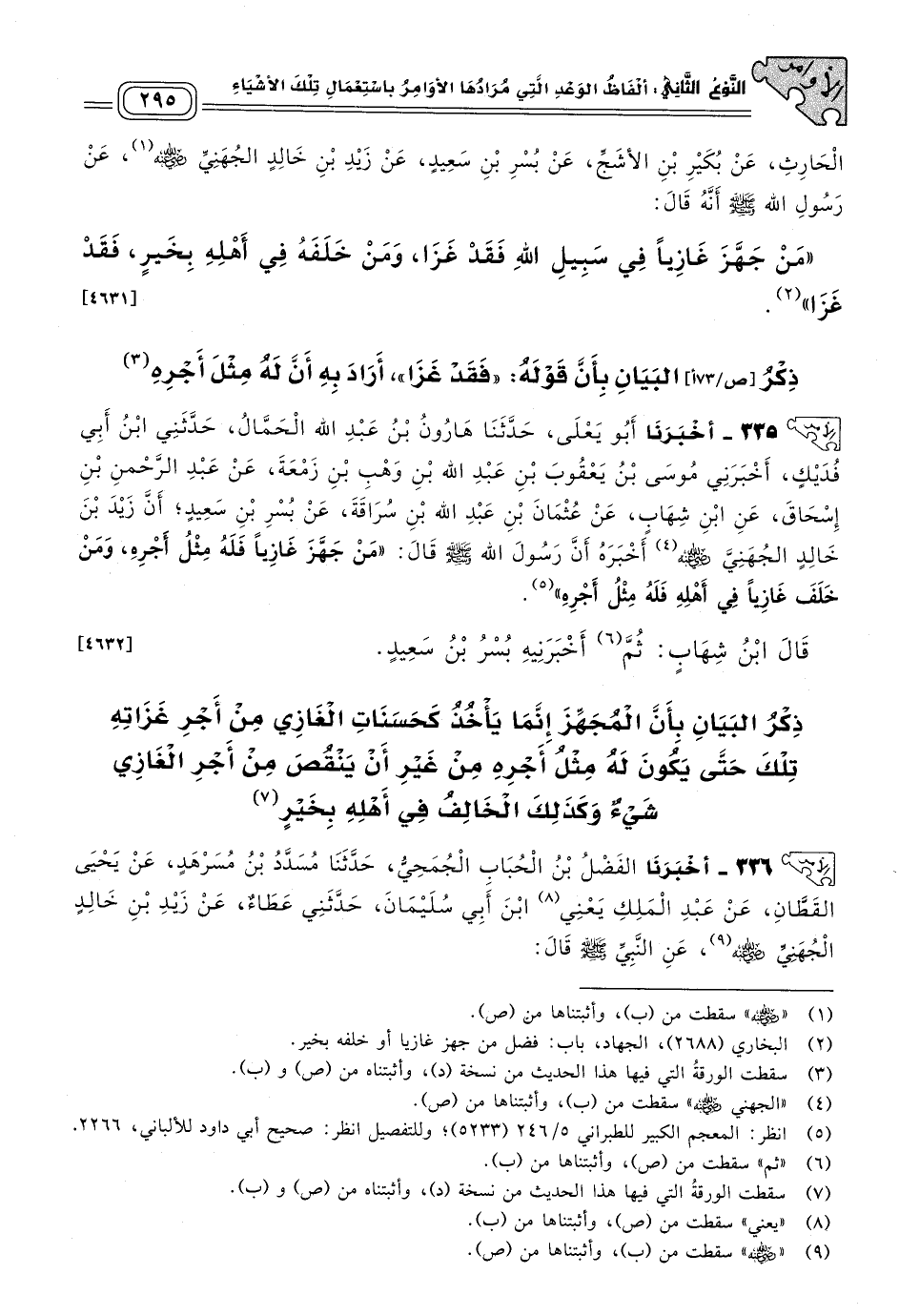 ٣٣٥ - أَخبَرنا أَبُو يَعْلَى، حَدثنا هَارُونُ بْنُ عَبْدِ اللهِ الْحَمَّالُ، حَدَّثَنِي ابْنُ أَبِي فُدَيْكٍ، أَخْبَرَنِي مُوْسَى بْن يَعْقُوبَ بْنِ عَبْدِ اللهِ بْنِ وَهْبِ بْنِ زَمْعَةَ، عَنْ عَبْدِ الرَّحْمَنِ بْنِ إِسْحَاقَ، عَنِ ابْنِ شِهَابٍ، عَنْ عُثْمَانَ بْنِ عَبْدِ اللهِ بْنِ سُرَاقَةَ، عَنْ بُسْرِ بْنِ سَعِيدٍ، أَنَّ زَيْدَ بْنَ خَالِدٍ الجهني رَضِيَ اللهُ عَنْهُ أَخْبَرَهُ، أَنَّ رَسُولَ اللهِ صَلى الله عَلَيه وسَلم قَالَ: "مَنْ جَهَّزَ غَازِيًا فَلَهُ مِثْلُ أَجْرِهِ، وَمَنْ خَلَفَ غَازِيًا فِي أَهْلِهِ فَلَهُ مِثْلُ أَجْرِهِ".