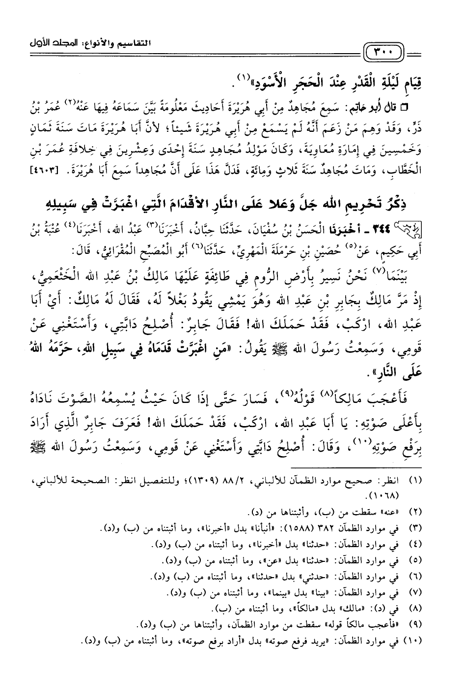 ٣٤٤ - أَخبَرنا الْحَسَنُ بْنُ سُفْيَانَ، حَدثنا حِبَّانُ، أَخبَرنا عَبْدُ اللهِ، أَخبَرنا عُتْبَةُ بْنُ أَبِي حَكِيمٍ، عَنْ حُصَيْنِ بْنِ حَرْمَلَةَ الْمَهْرِيِّ، حَدثنا أَبُو الْمُصَبِّحِ الْمُقْرَائِيُّ، قَالَ: بَيْنَمَا نَحْنُ نَسِيرُ بِأَرْضِ الرُّومِ فِي طَائِفَةٍ عَلَيْهَا مَالِكُ بْنُ عَبْدِ اللهِ الْخَثْعَمِيُّ إِذْ مَرَّ مَالِكٌ بِجَابِرِ بْنِ عَبْدِ اللهِ وَهُوَ يَمْشِي يَقُودُ بَغْلاً لَهُ، فَقَالَ لَهُ مَالِكٌ: أَيْ أَبَا عَبْدِ اللهِ ارْكَبْ فَقَدْ حَمَلَكَ اللهُ، فَقَالَ جَابِرٌ: أُصْلِحُ دَابَّتِي وَأَسْتَغْنِي عَنْ قَوْمِي، وَسَمِعْتُ رَسُولَ اللهِ صَلى الله عَلَيه وسَلم يَقُولُ: "مَنِ اغْبَرَّتْ قَدَمَاهُ فِي سَبِيلِ اللهِ حَرَّمَهُ اللهُ عَلَى النَّارِ"، فَأَعْجَبَ مَالِكًا قَوْلُهُ فَسَارَ حَتَّى إِذَا كَانَ حَيْثُ يُسْمِعُهُ الصَّوْتَ نَادَاهُ بِأَعْلَى صَوْتِهِ: يَا أَبَا عَبْدِ اللهِ ارْكَبْ، فَقَدْ حَمَلَكَ اللهُ، فَعَرَفَ جَابِرٌ الَّذِي أَرَادَ بِرَفْعِ صَوْتِهِ، وَقَالَ: أُصْلِحُ دَابَّتِي وَأَسْتَغْنِي عَنْ قَوْمِي، وَسَمِعْتُ رَسُولَ اللهِ صَلى الله عَلَيه وسَلم يَقُولُ: "مَنِ اغْبَرَّتْ قَدَمَاهُ فِي سَبِيلِ اللهِ حَرَّمَهُ اللهُ عَلَى النَّارِ"، فَتَوَاثَبَ النَّاسُ عَنْ دَوَابِّهِمْ، فَمَا رَأَيْنَا يَوْمًا أَكْثَرَ مَاشِيًا مِنْهُ.